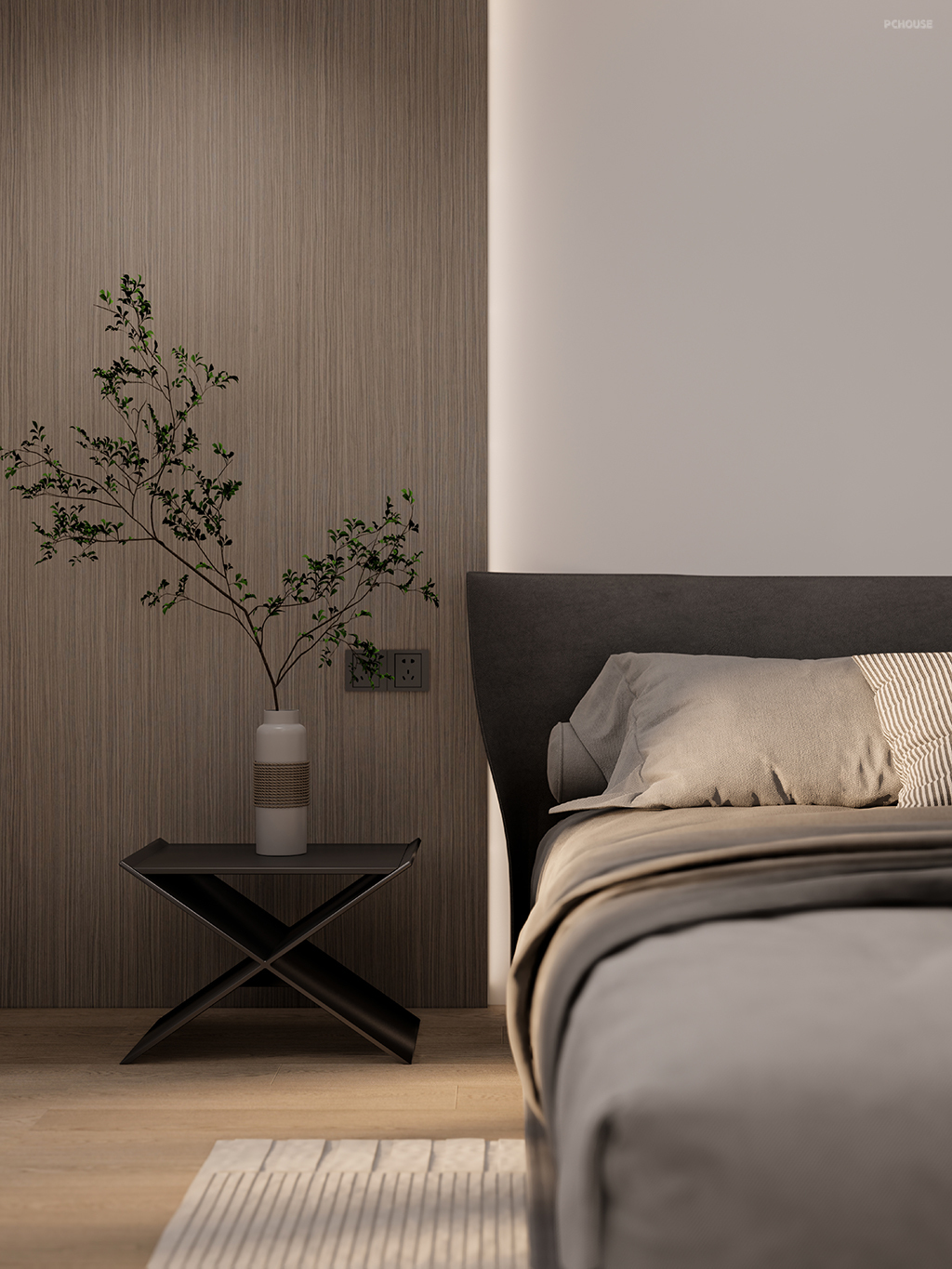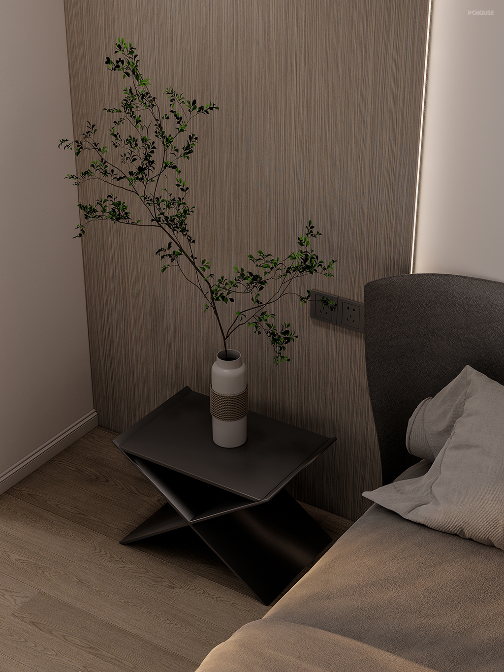 浅木纹为卧室带来舒适温馨的装饰感,别出心裁的小架子上,一丛绿植点缀其间,带来富有生机与活力的清爽气息。