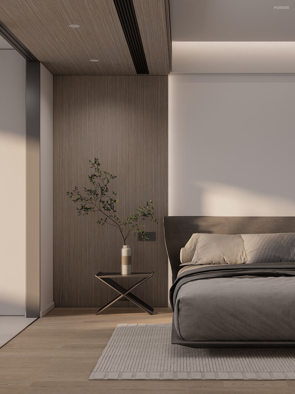 床品选用深灰与浅灰交错,使得色彩搭配之间显出一分疏落灵动,精巧储物格以背灯衬托,打造满满高级感。