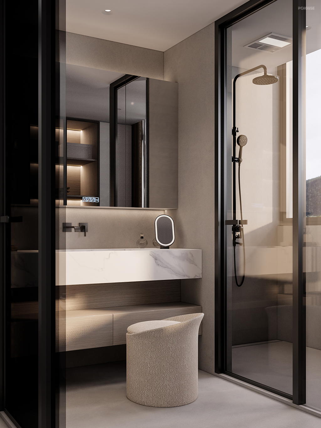 简约大方的几何形状将空间分隔得错落有致,大块镜面令洗漱变得更加轻松。利用墙体做壁龛收纳,置入加热毛巾架,喷枪,正是空间虽小,五脏俱全。