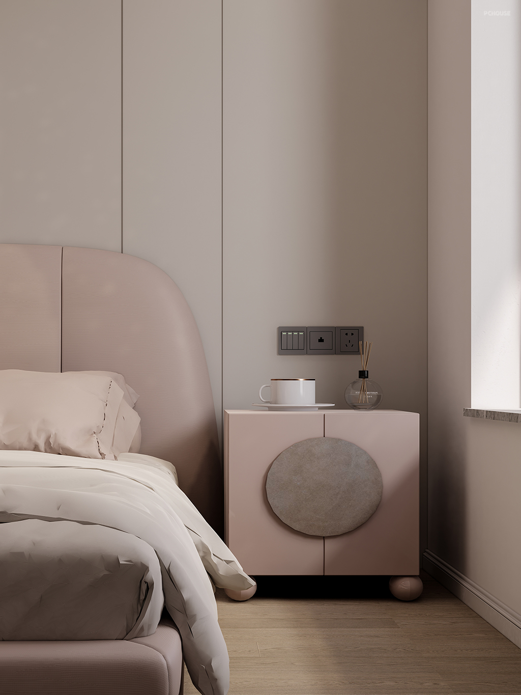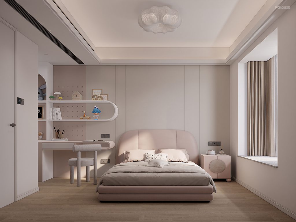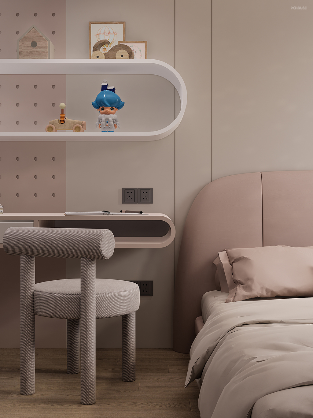 属于孩子的一方天地里,暖灰与淡粉成为房间中的主色调,白色置物架点亮视野,木纹的温和铺就静默的安定感。钝圆的床角与桌椅,为童年带来更加安全的生活体验。