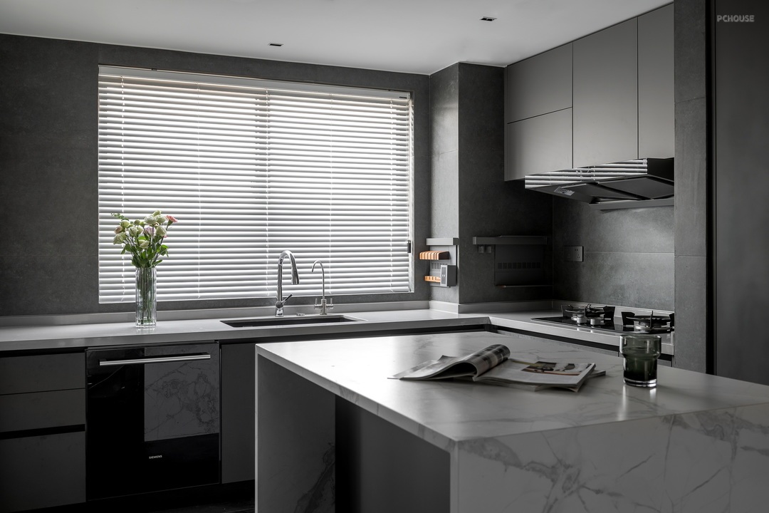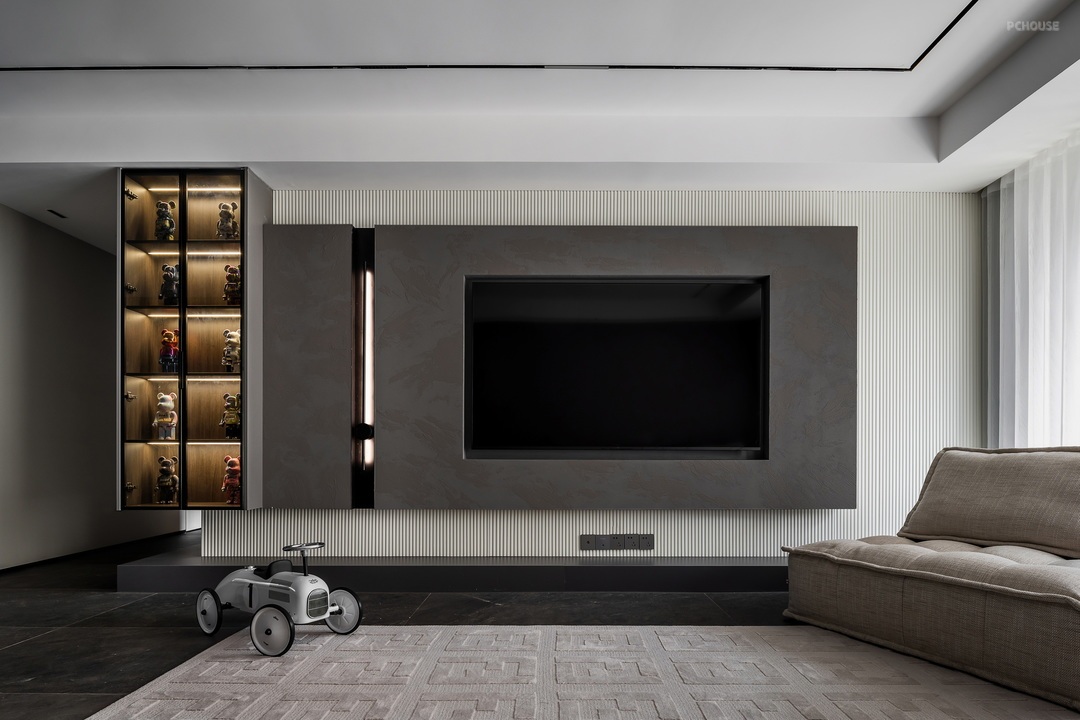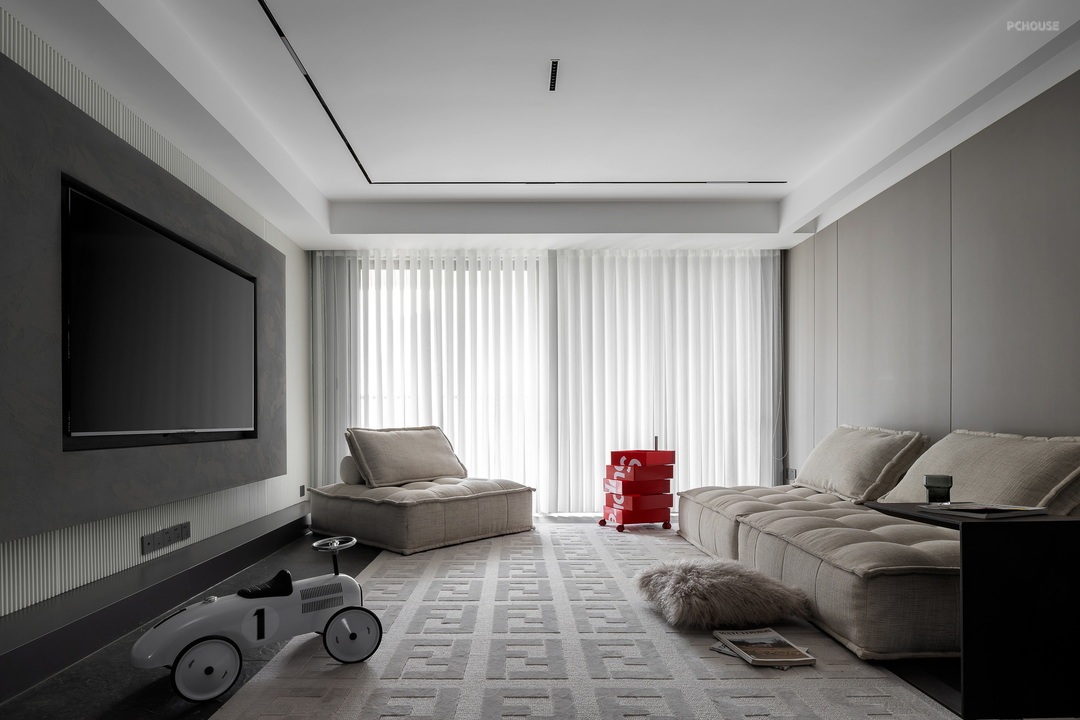 我们将厨房的门体拆除,在厨房的右边设置了西厨区,让中西厨两个空间都围绕着餐厅,视觉上扩大空间的同时,在使用上面人为创造了一个洄游动线,兼具功能性的同时增加了观赏性。再将电视墙的正面墙体做消减,围绕着消减部分设置了储物柜和屋主的藏品展示柜,大大提升了公区储物能力。打造了去茶几化的客厅,打破了家居的常规布局,同时扩大了孩子在客厅区域的玩耍空间,最终在各方面的积极配合之下,将这套案例呈现在各位眼前......