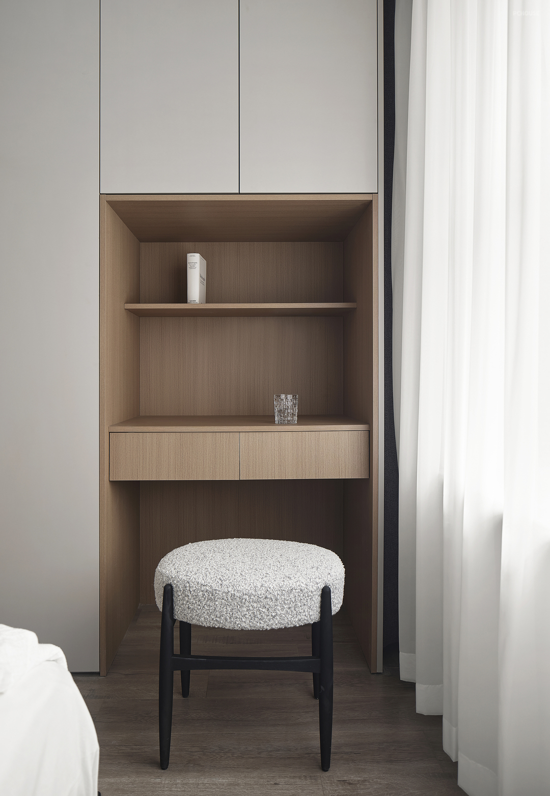 刻意提升温润调木质的使用比例,为私领域增加温度感。床背景以硬包铺陈,用纯粹的体块组构出几何层次让屋主在私领域中更放松、自由。