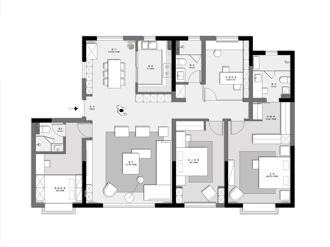 业主为60后,对生活品质的要求比较高,追求宁静旷达的心境,平时喜欢与家人一起喝茶,所以在规划时,茶室的墙体被拆掉,换成了玻璃隔断,让茶室空间更通透,这点深得业主欢喜。