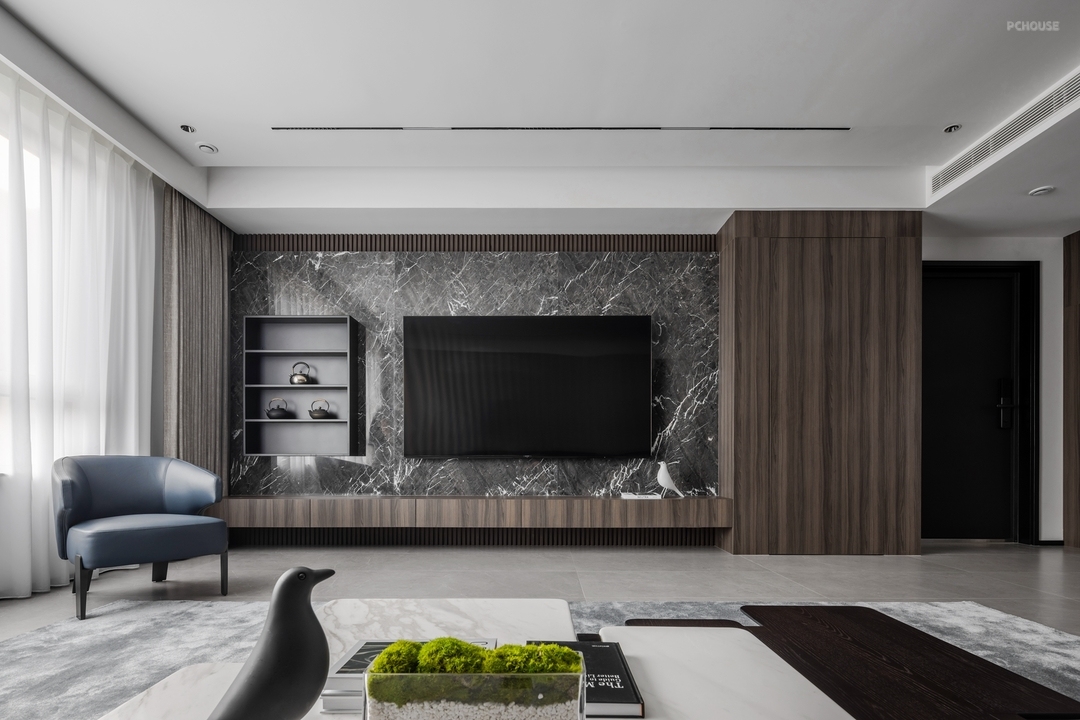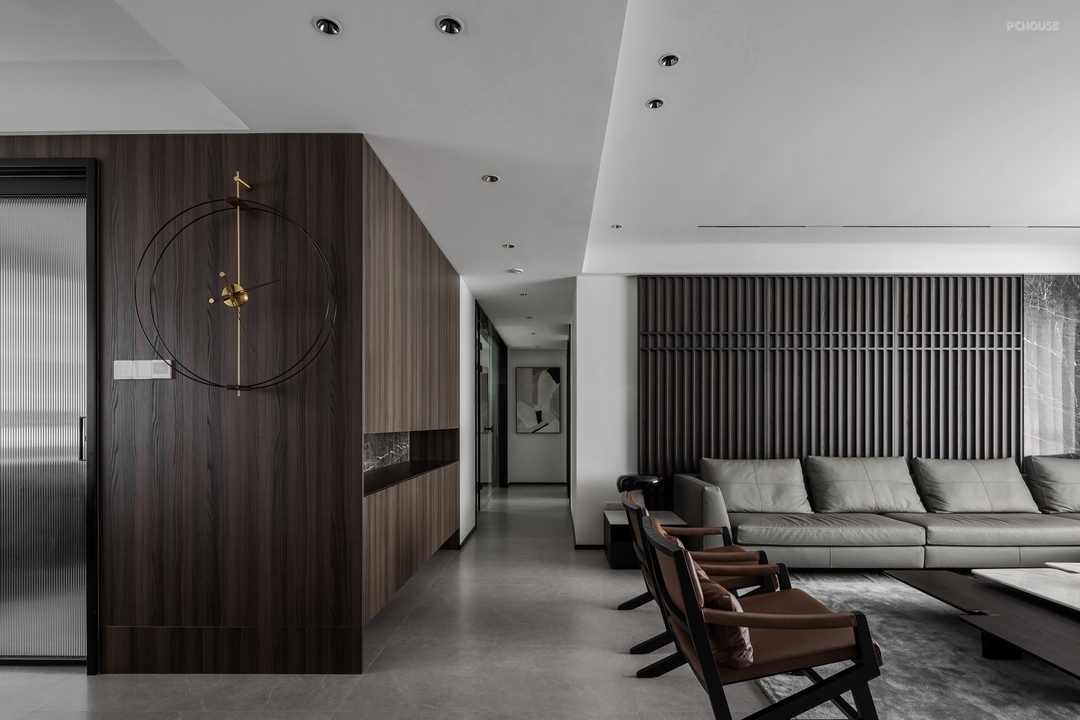 客厅的布局敞阔雅致,艺术、人文、功能在这里交汇,既挥洒出浑然天成的主人气魄,也浸润着新中式的秀丽雅韵。客厅电视墙的后面为客房,设计师将材质延展串联,妙手处理成隐形门,赋予客厅完整而统一的写意气质。