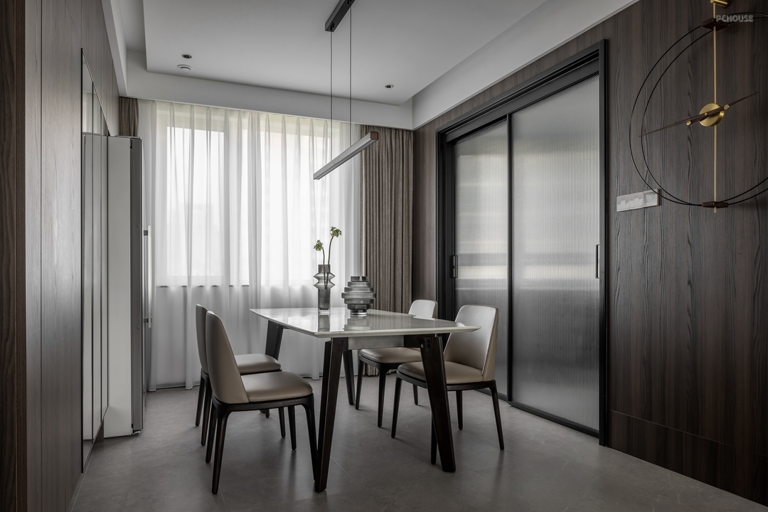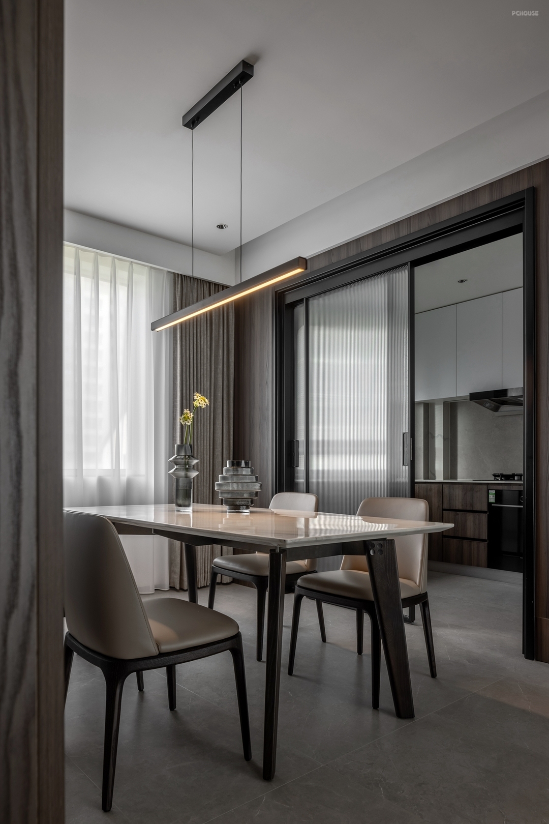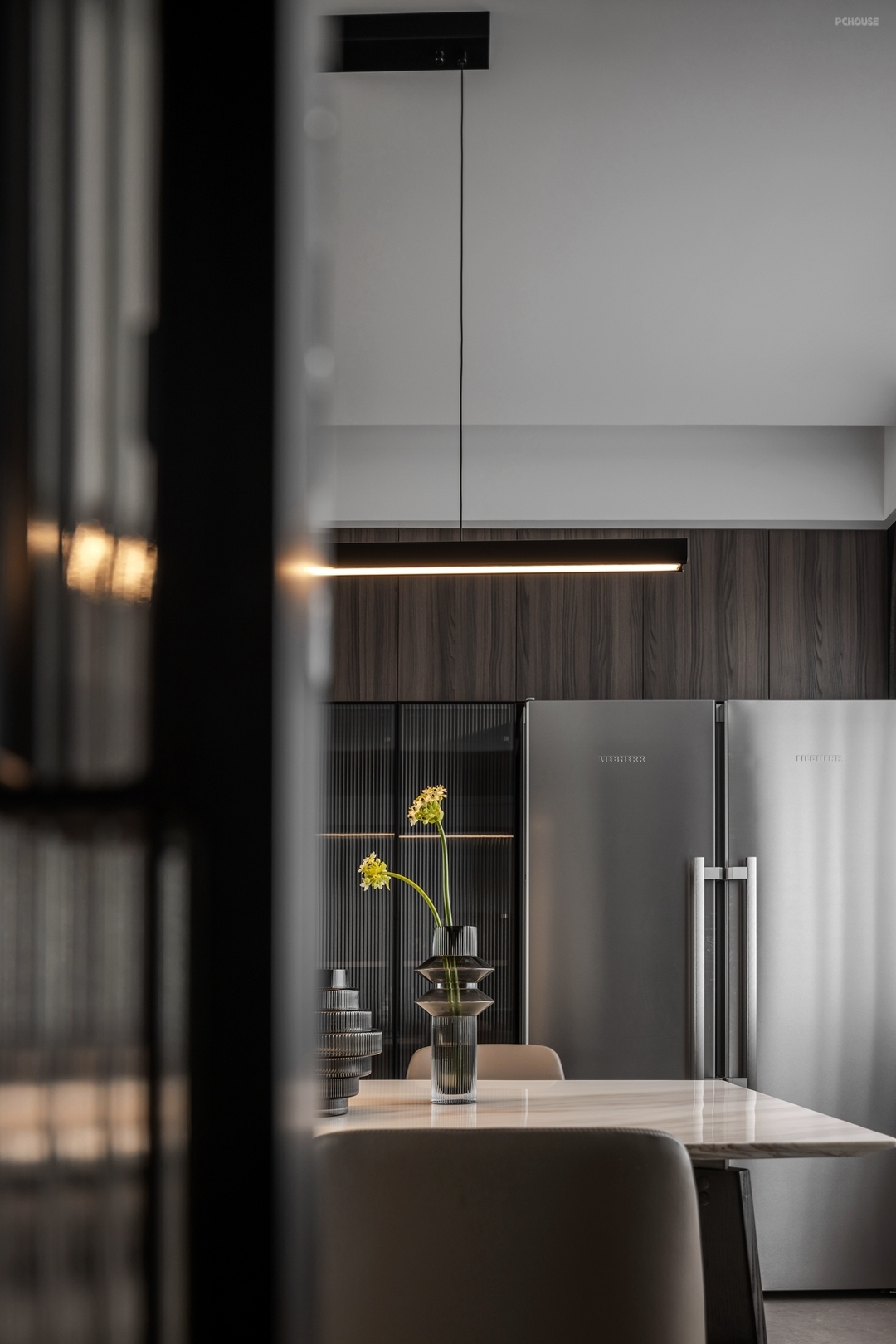 由餐厅贯通至厨房,空间气韵继续蔓延,典雅流淌到每一处。简洁而流畅的线条穿梭于不同材质的块面之间,木纹装饰既丰富了场所的视觉形态,亦不乏结构上的层次与秩序,温润与理性共鸣,每一餐都荟萃着诗意。