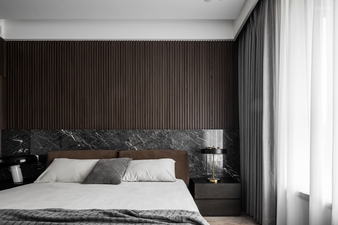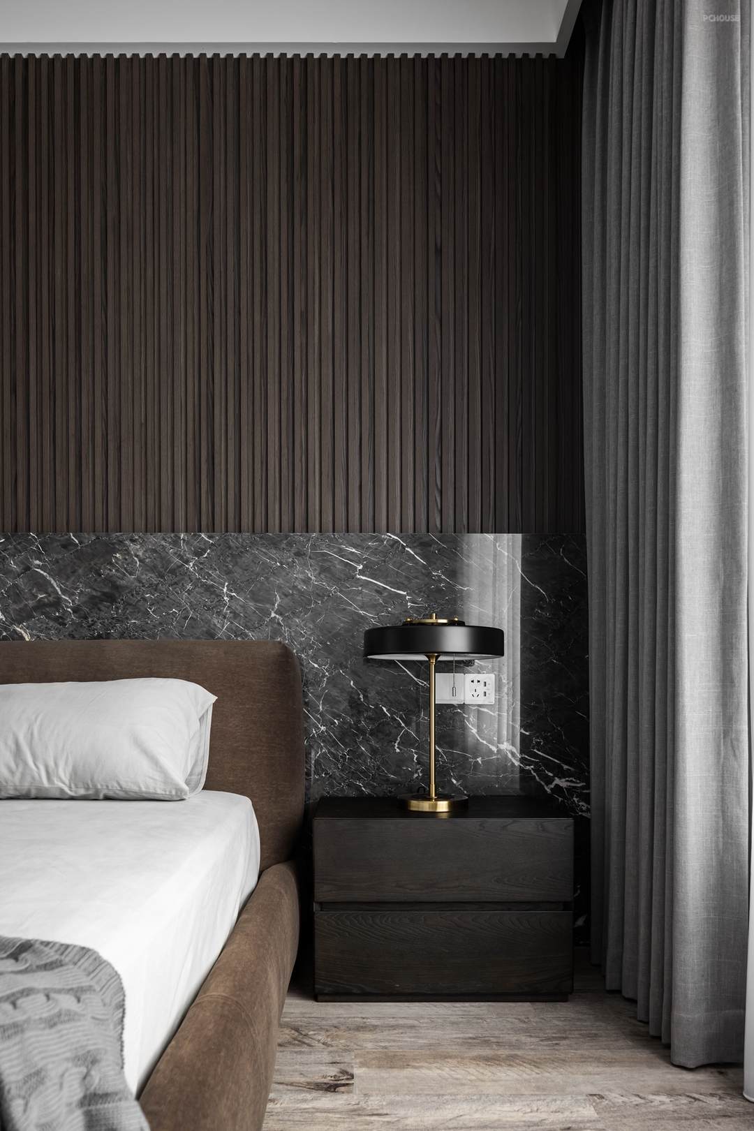 空间以大面积的木色做铺叙,加之灯饰、床头柜等小品的点缀,让空间的质感取得动态平衡,达至品质与艺术、功能与内涵并存的和谐统一,油然衍生无言的欢愉与心安。