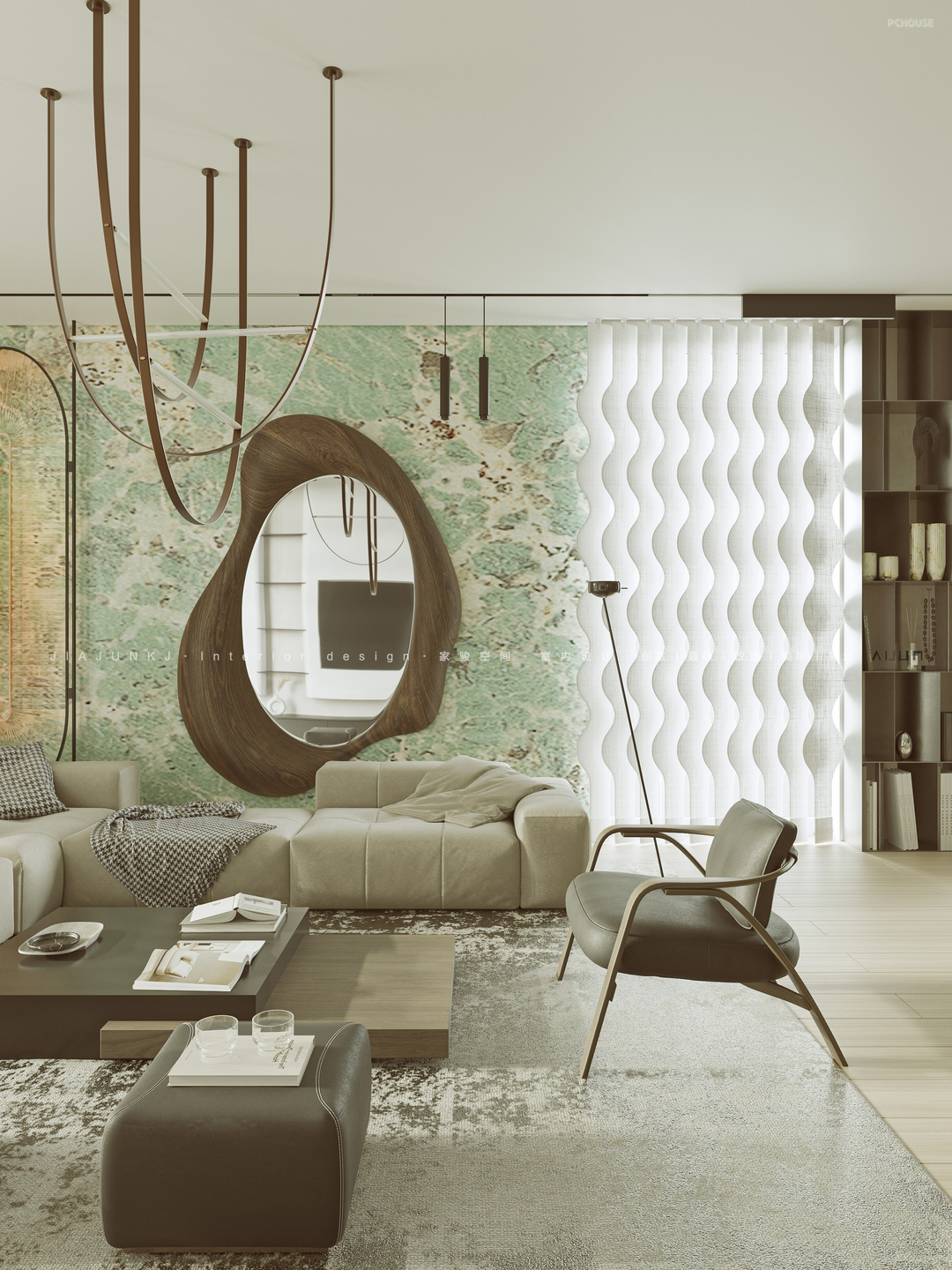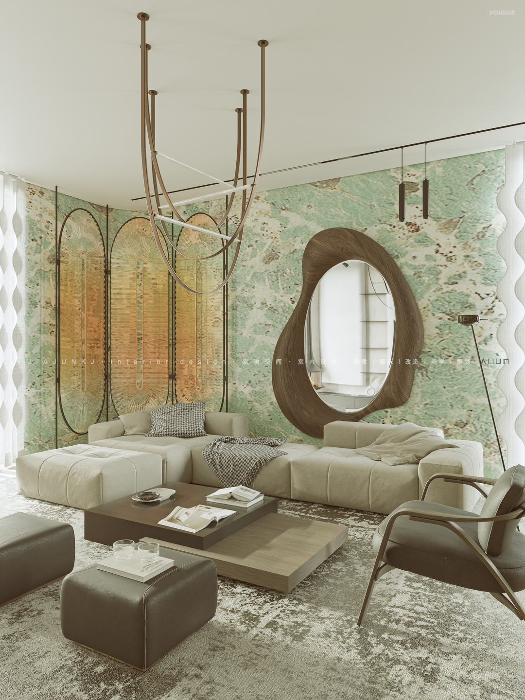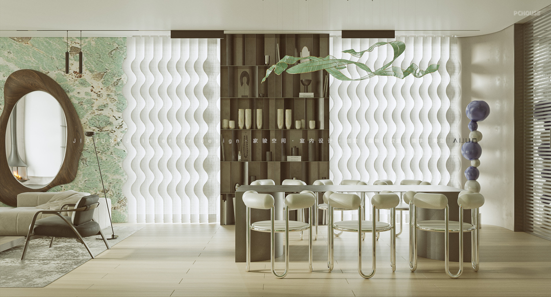 客厅主材用到了多层实木复合地板、大理石、艺术漆。软装方面窗帘和沙发后面的墙面装饰品是比较与众不同的,窗帘叫波纹梦幻帘,沙发后面的装饰镜是定制产品,一圈为实木雕刻,中间是一个椭圆的镜子,起到了空间延伸的作用,也成为了空间的点睛之笔。镜子、波纹产生了一种虚幻的视觉效果,弱化了空间的边界感,也让空间更有活力。