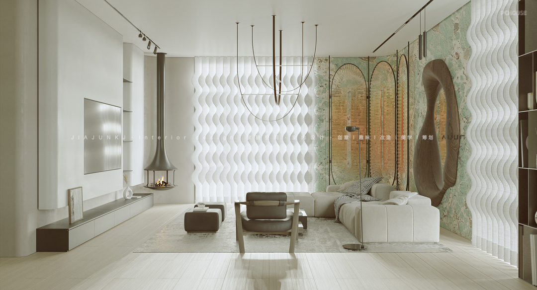 拐角组合沙发在大空间内更容易凸显出沙发的大气感,中间摆放了具有高低层次和材质区分的大茶几,具有现代简约感的组合沙发让空间不再繁琐,也能更好的凸出背景墙大理石的自然纹路质感,以及软装的修饰,阴角的位置摆放了一组通顶的屏风为的是美化阴角,让空间内处处都能发现美。