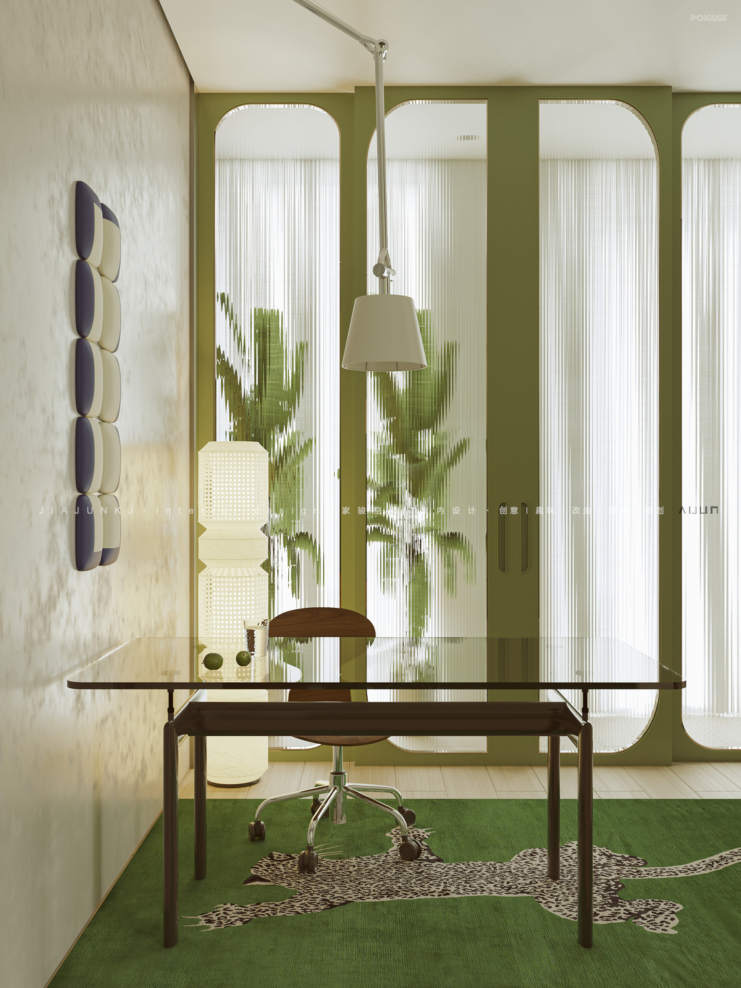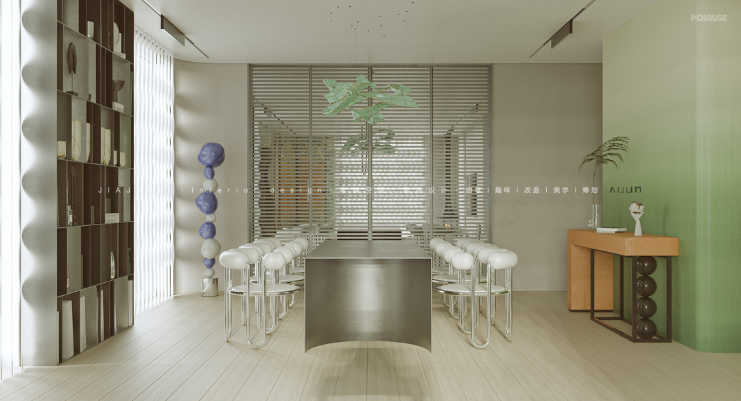 两个窗户之间用通顶的装饰柜子进行分割,直上直下的通顶感相比只放一个半高的餐边柜会更加有完整性。装饰柜的材质为钢板,能够做到又薄又坚固,表面喷涂特调的颜色,有种金灰色的质感。墙角摆放了艺术品雕塑,蓝白相间,色系方面白色与餐椅相呼应,蓝色与绿色不仅互补,也有点小对比的感觉。