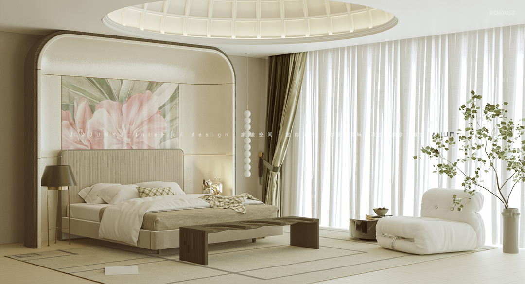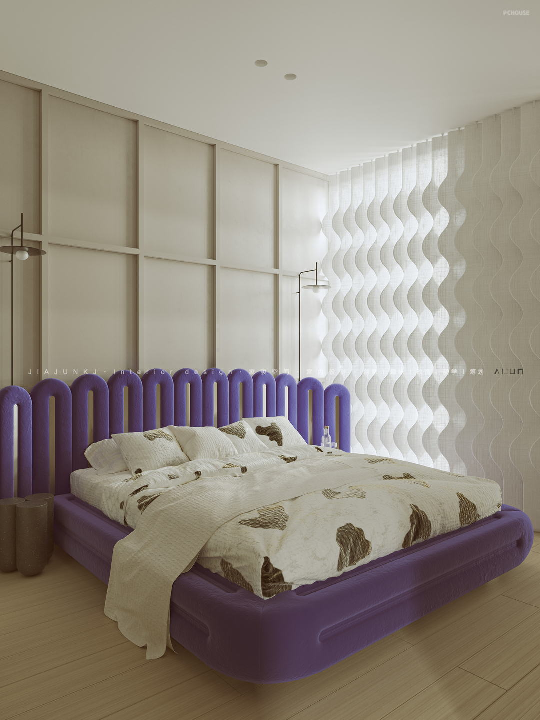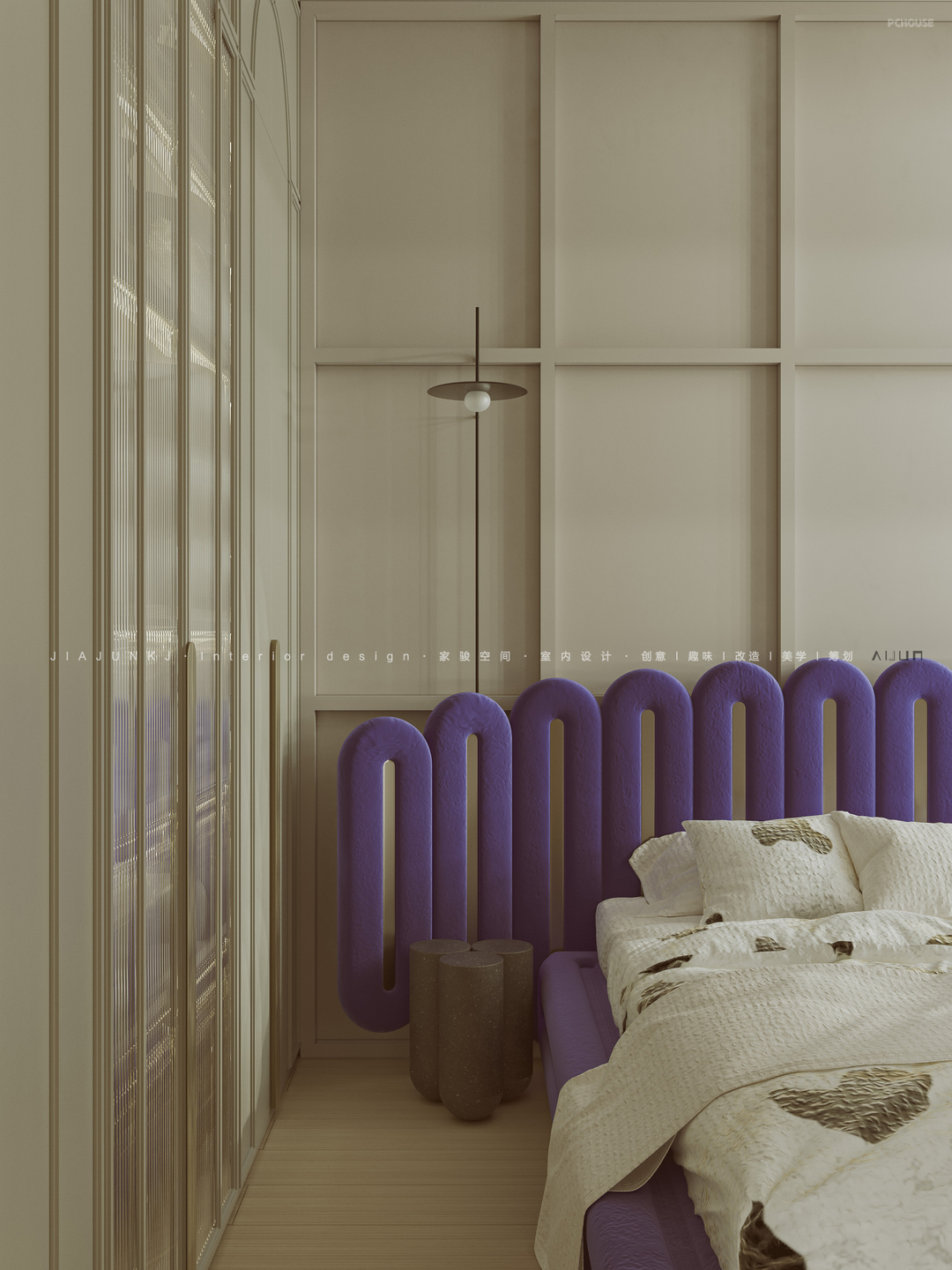 次卧可以当作父母房使用,也可以给客人留宿的时候使用,在设计方面没有顾及到这个房间使用者的年龄和情况,把美放在了第一位,软装配式和色系与外面的画风一致,比较出彩的是床的造型,有点小浮夸,也有点小轻奢的感觉,就连床头两侧的壁灯也是营造出了仪式感。