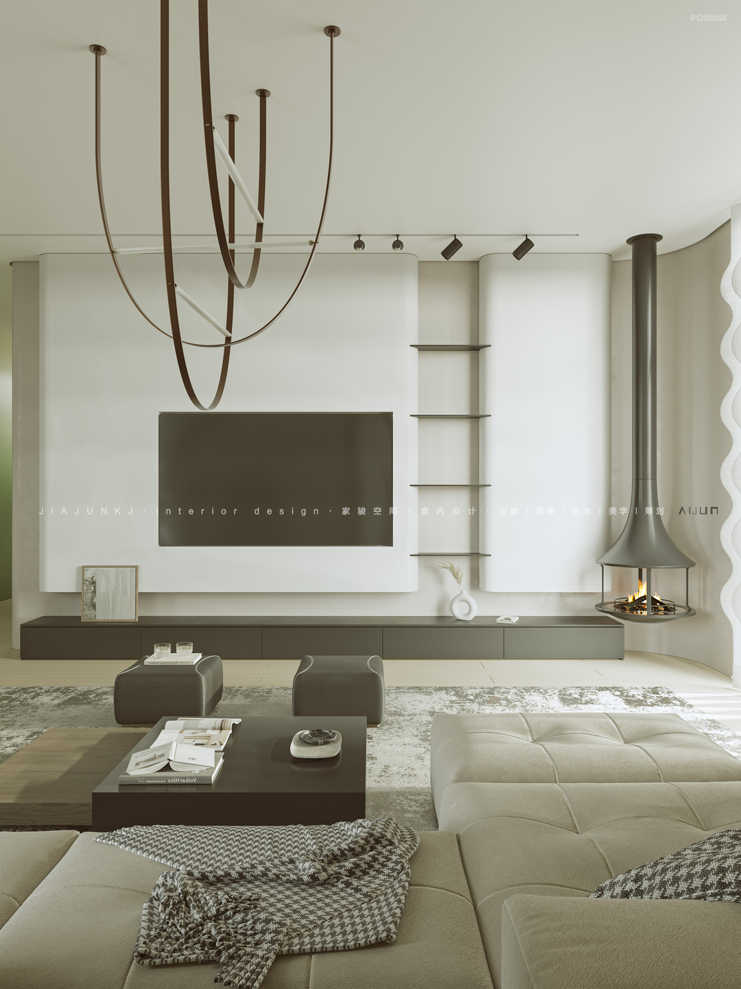 电视背景墙非常的简洁,采用了分段分离式的设计方法,让背景墙变得也更有空间感,在新建的墙体上用轻钢龙骨做支架,再用石膏板封面,阳角的地方都进行弧度处理,让墙面变得具有圆润感,内嵌式的电视机让背景墙显得更加的平整,右侧设计了一个悬吊式的取暖炉,营造出欧美的生活氛围。