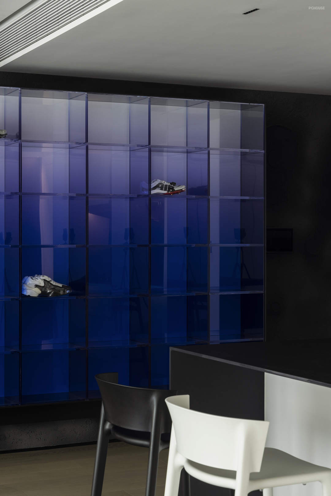 开灯后鞋架的灯光更为充足,对于屋主珍藏的各色鞋品也能呈现出更为细致的展示效果,同时方便屋主拿取鞋品。开灯后其视觉效果也会随之改变,从单纯的克莱因蓝渐变,转而变成暖-冷的渐变,视觉上层次更为丰富,冷暖光线对立又和谐的融合过渡,让空间具有更多的可能性。