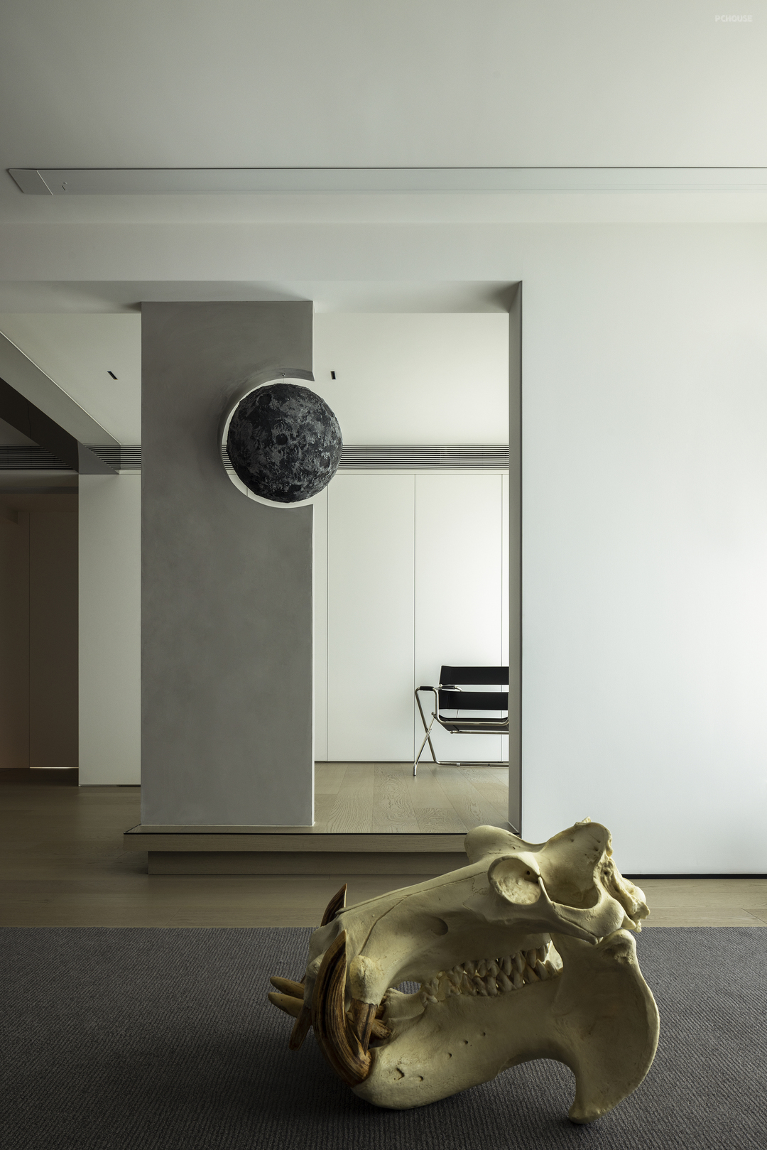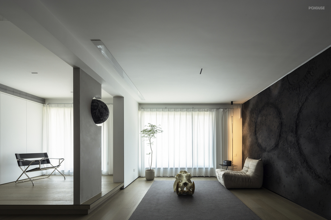 以月球元素装饰极简之家,因此案位于苏州河畔,层高较高,于视觉上能更好的呈现空间感。背景墙采用微水泥定制造型,呈现出立体的月球表面的视觉效果,兼具设计美感与纵深感,为简约留白的家增添一抹神秘的韵味。