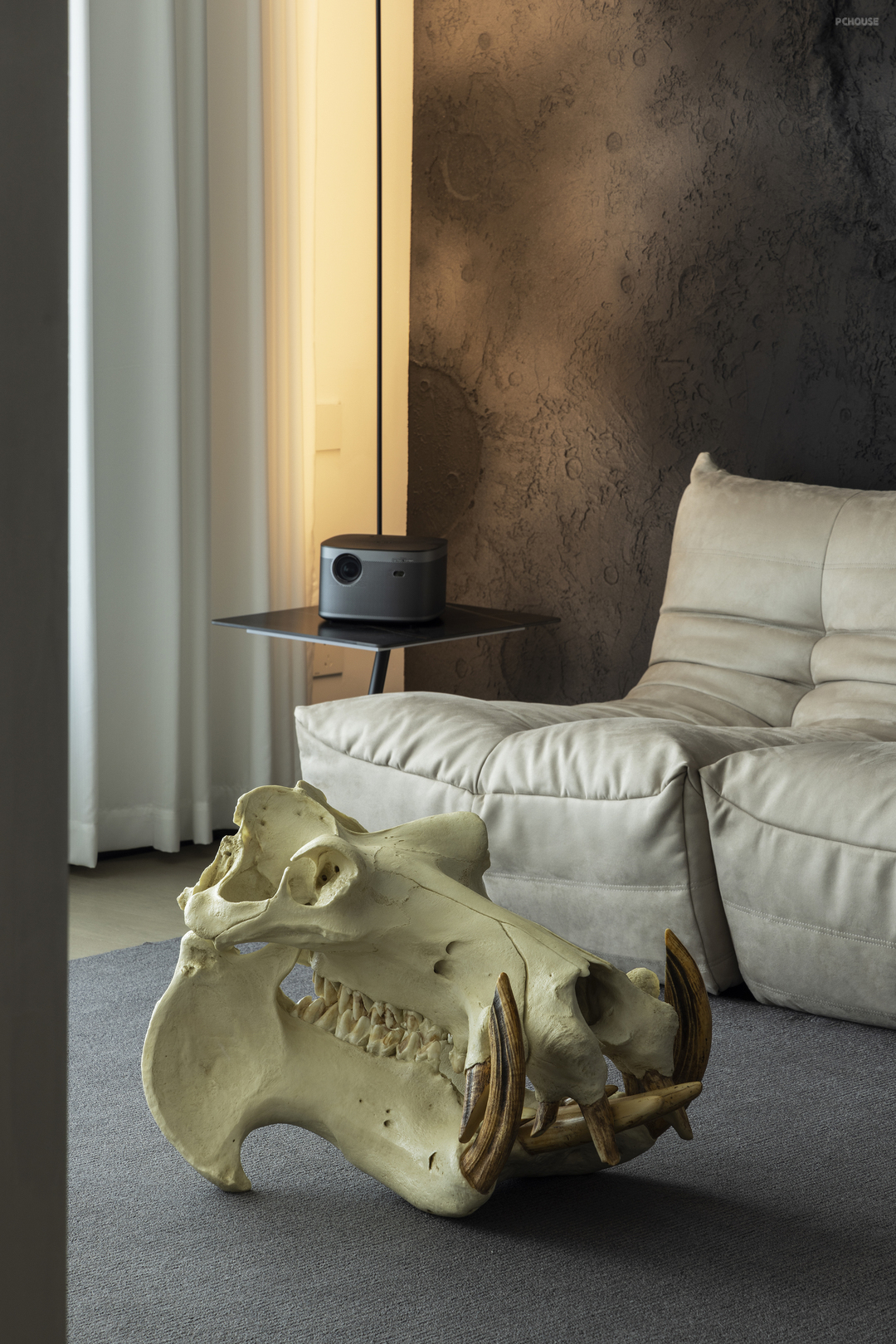 写意空间Togo单人沙发时尚而柔软,与背景墙的冷硬质感形成碰撞与冲突感,视觉效果更为复杂多样化,搭配头骨化石模型,空间悠远神秘的气质顿然而生。