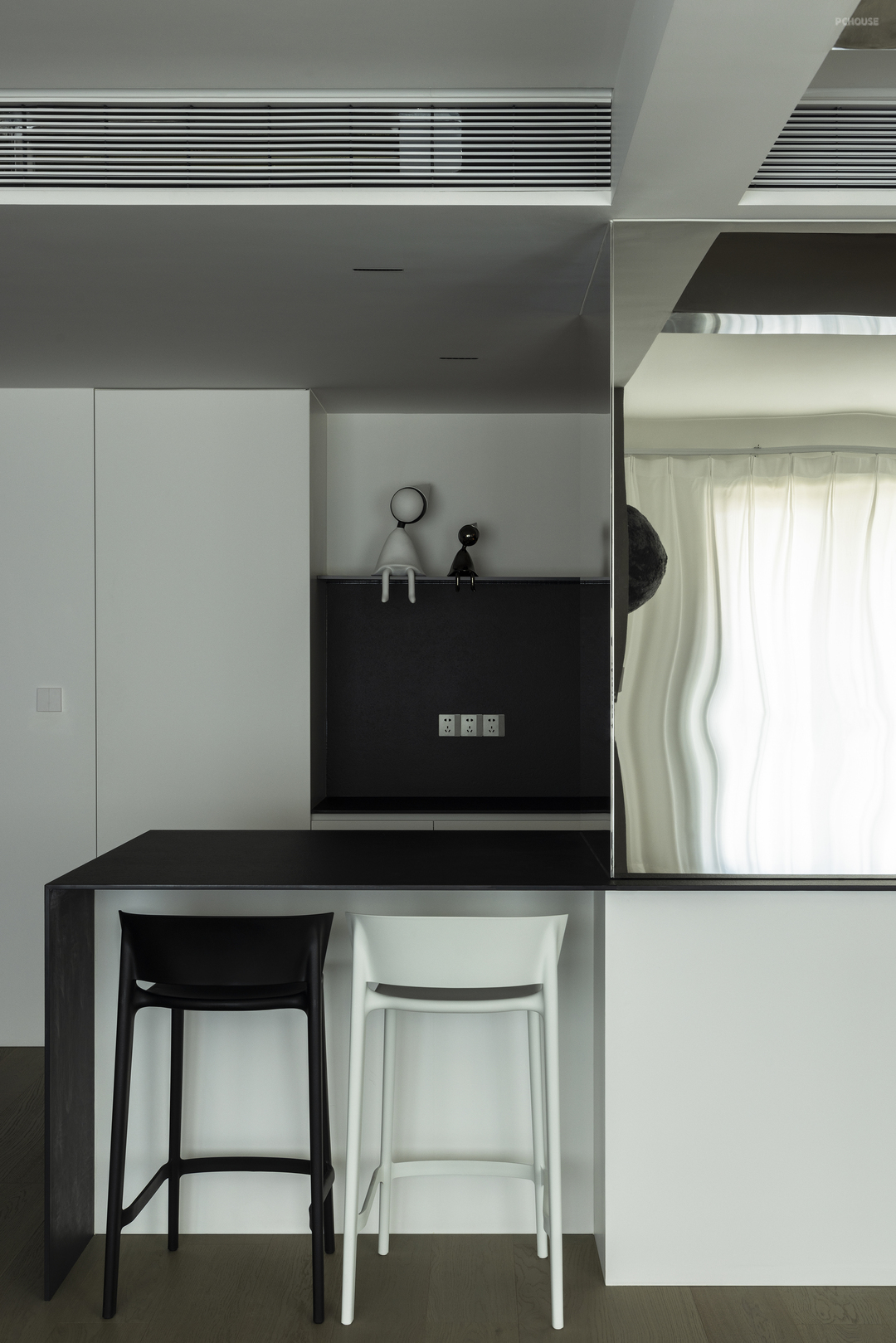 吧台下方预留足够空间,未使用时方便收起餐椅,减少过道使用面积,活动空间更为宽敞,坐下使用时也更契合人体工学结构,于细节处提升舒适度。