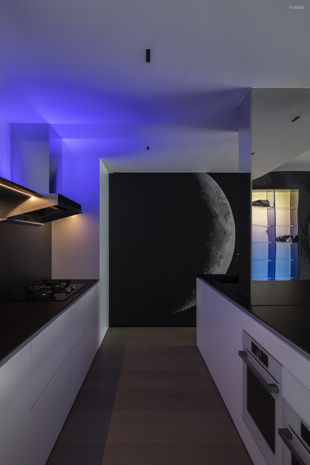 厨房视野尽头为主卧侧墙,以黑色作为底色,月球壁画装饰,与客厅背景墙的微水泥月球造型彼此呼应,气质上更为完整统一。灯光设计契合背景墙图案,于吊顶内部嵌入反光灯带,光落于月球最高点,更显栩栩如生,仿佛将这一方空间带入某个宇宙空间的一角,浪漫而神秘。