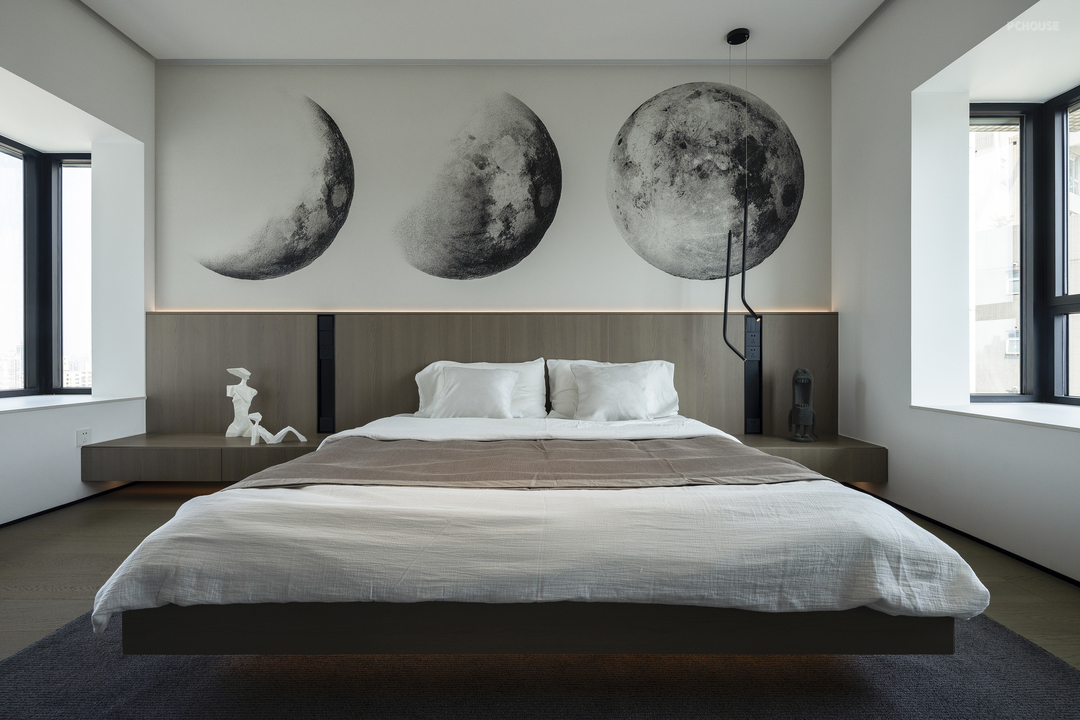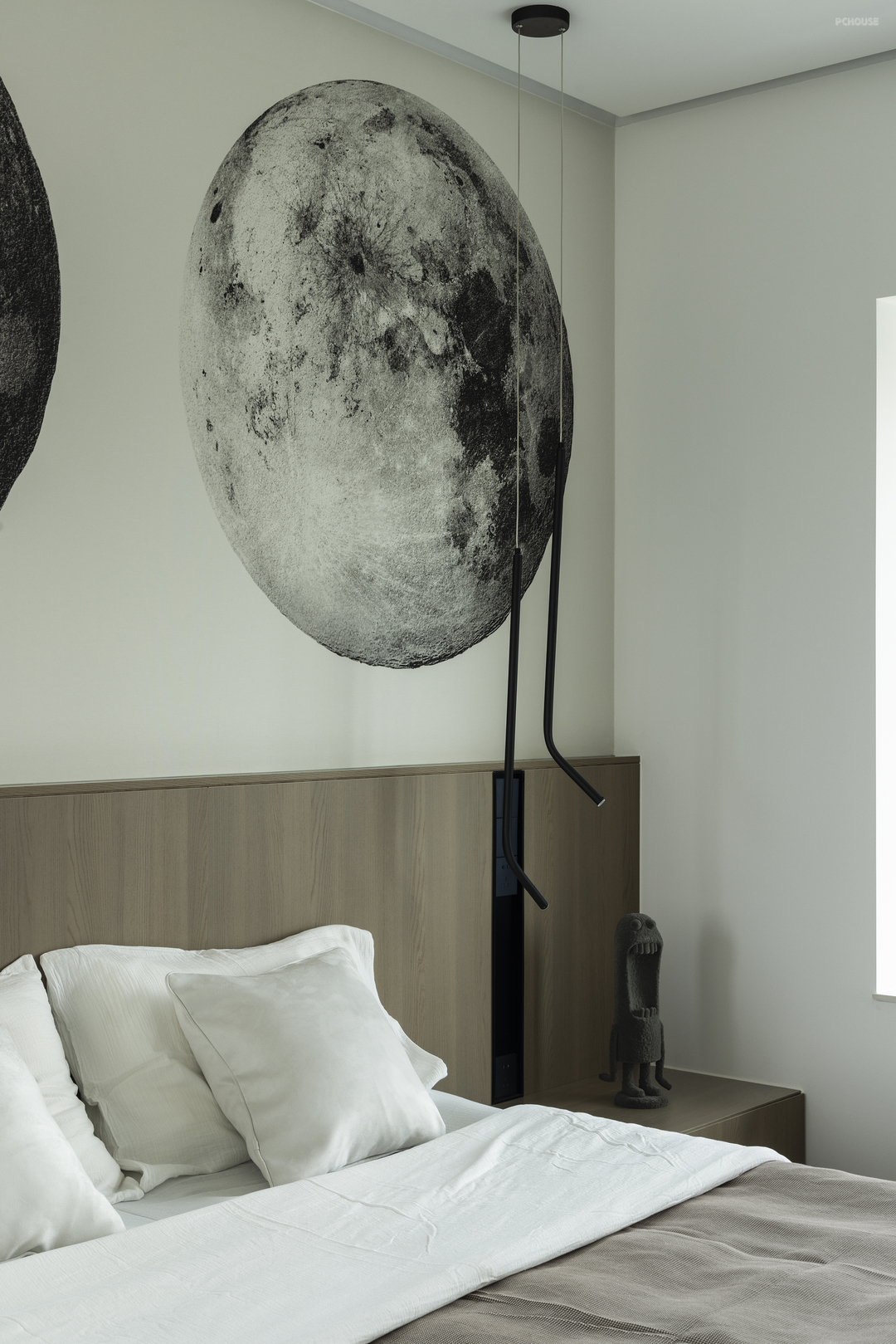 主卧延续整体风格,背景墙定制木饰面及床头柜作为装饰,兼顾实用性,视觉上更为温和,清爽白墙作为底色,保留极简的利落之感,上半墙为定制的装饰画,圆缺时令不一的月球彼此交相呼应,逼真感让月球犹如实体,增加空间感。