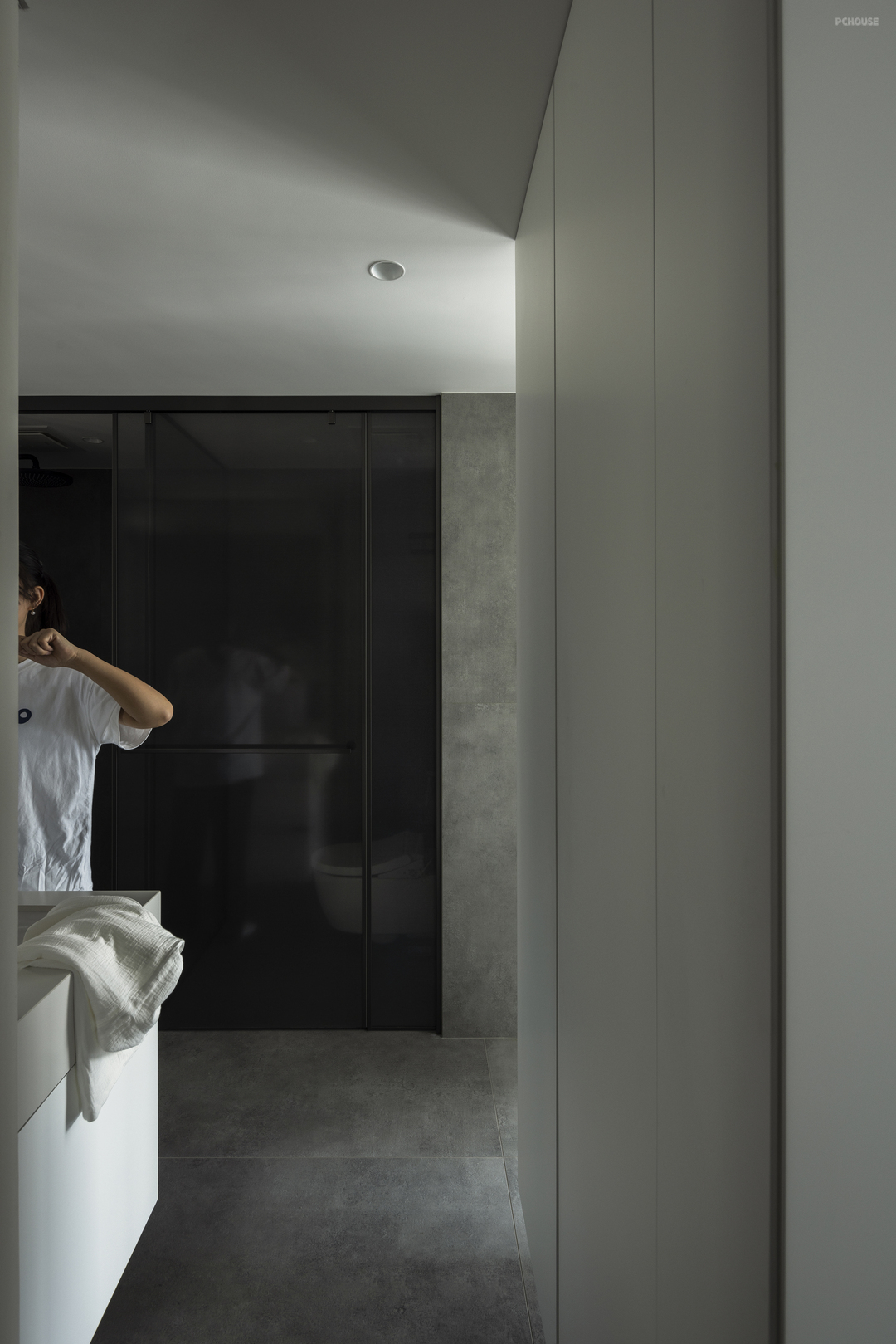 主卫看向次卫。 主卫和次卫打通后,从客厅到卧室形成客餐厨-次卫-主卫-主卧-客餐厨的洄游动线,空间更通透,采光、通风、收纳都更为良好,靠墙定制柜体,满足洗手间置物需求,视觉上也保留极简质感。