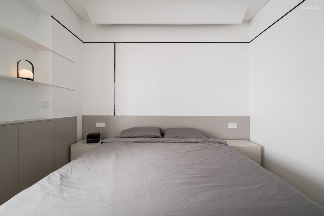 床头与临窗收纳柜做了一个延伸和转折,远看收纳柜和床头都融合在空间里~