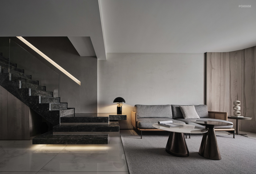 ✨楼梯位置的调整让垂直空间得到了最好的交融。 ✨楼梯的位置从阴暗的角落改造到明亮的客厅,打破传统楼梯入口的处理方式,入口方向从一面设计为三面,大大提升了使用效率。将沙发边几融入楼梯的踏步结构,丰富了楼梯的艺术性。 ✨艺术漆与大理石台阶的碰撞,刚柔并济。结构柱多出墙面的空间,我们整面墙拉平。巧妙的将楼梯的扶手内嵌。影木材质延伸到扶手上,附上灯光,让硬朗的空间多了一条触摸的温度。