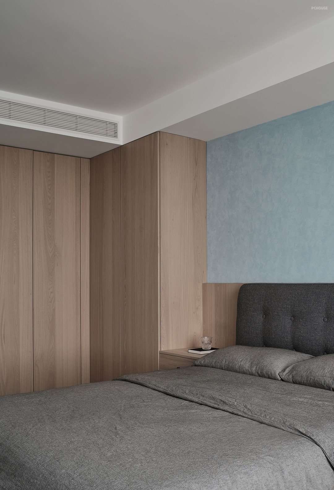 作为家中的静谧区域,我们用了整面的护墙板去凸显质感,哑光皮质的床头,让空间层次分明,透光石的台灯,削弱了线条带来的硬朗。