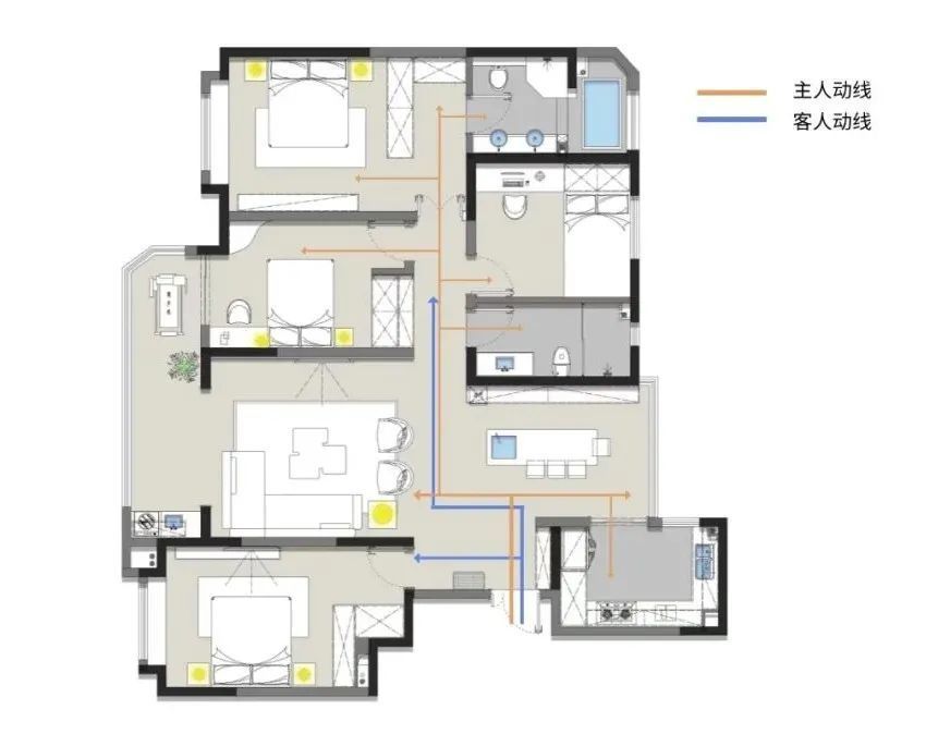 ①基于业主一家的生活习惯,将其中一个卫生间改造成储物间和临时客房,提高空间利用率。