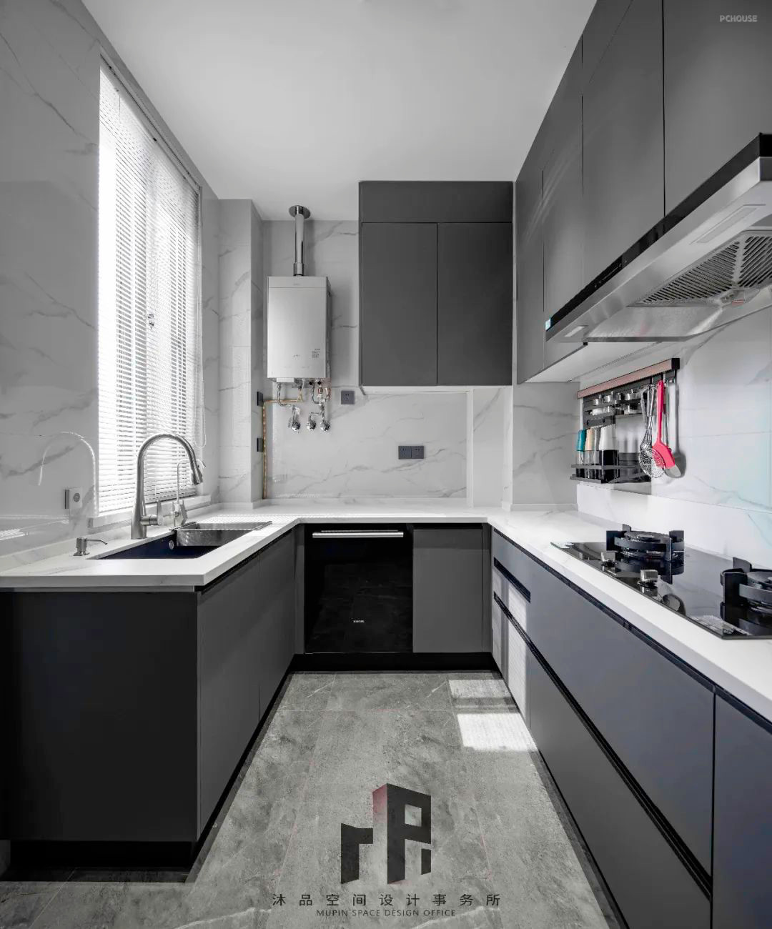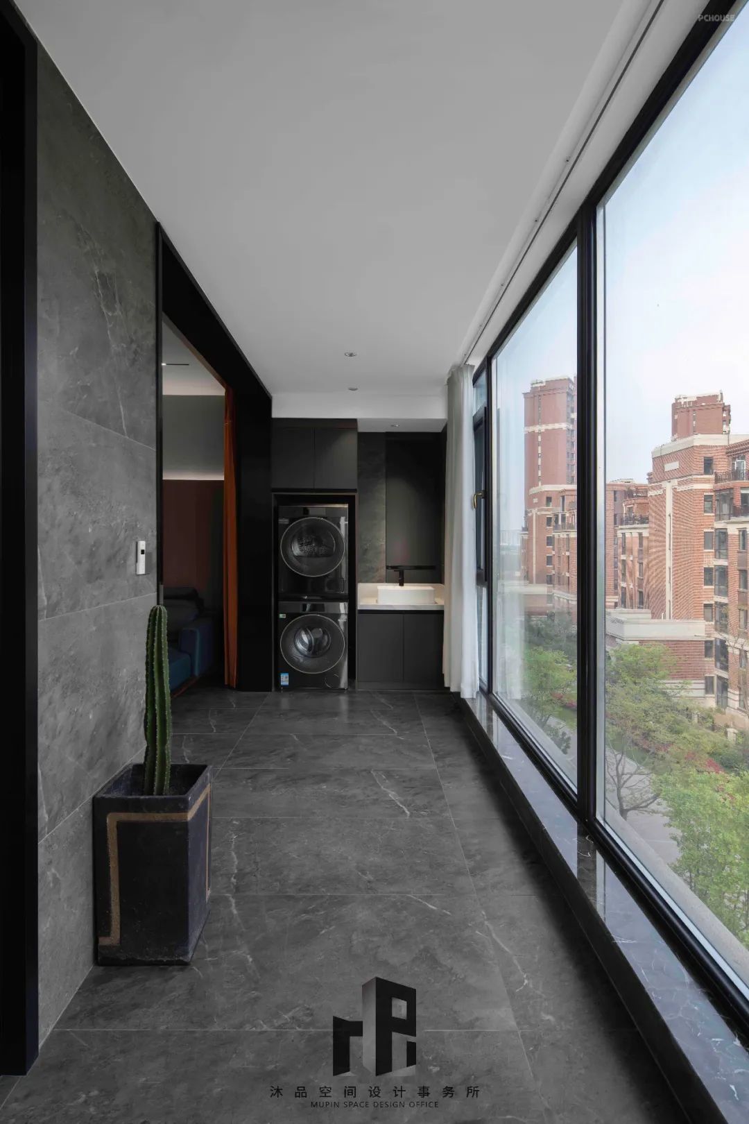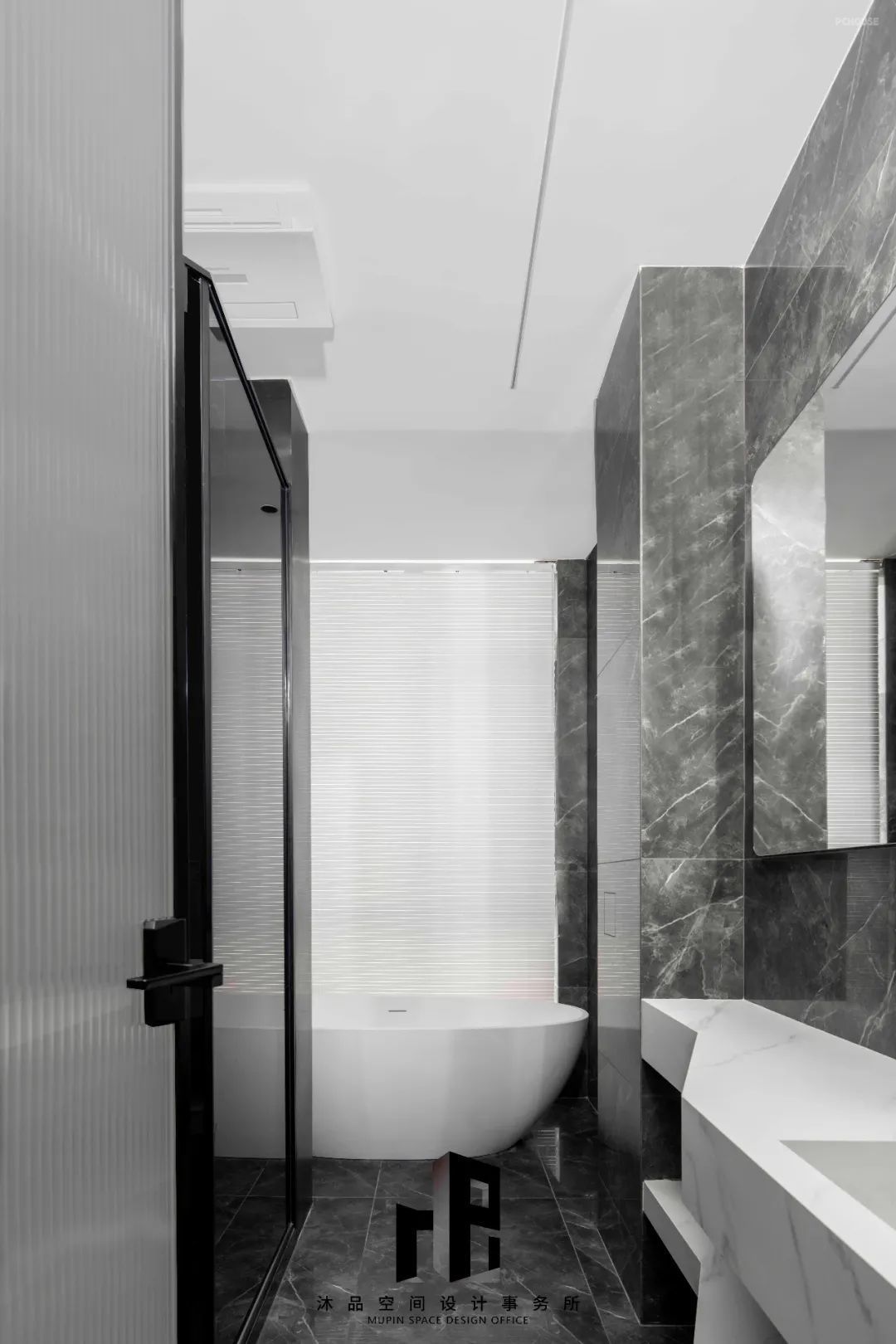 ③主卫更改门的开合方向,让台盆与马桶区域相对,简化了家务动线,单独设置淋浴房,以及黑色不锈钢型材的壁龛,充满设计师的小巧思。