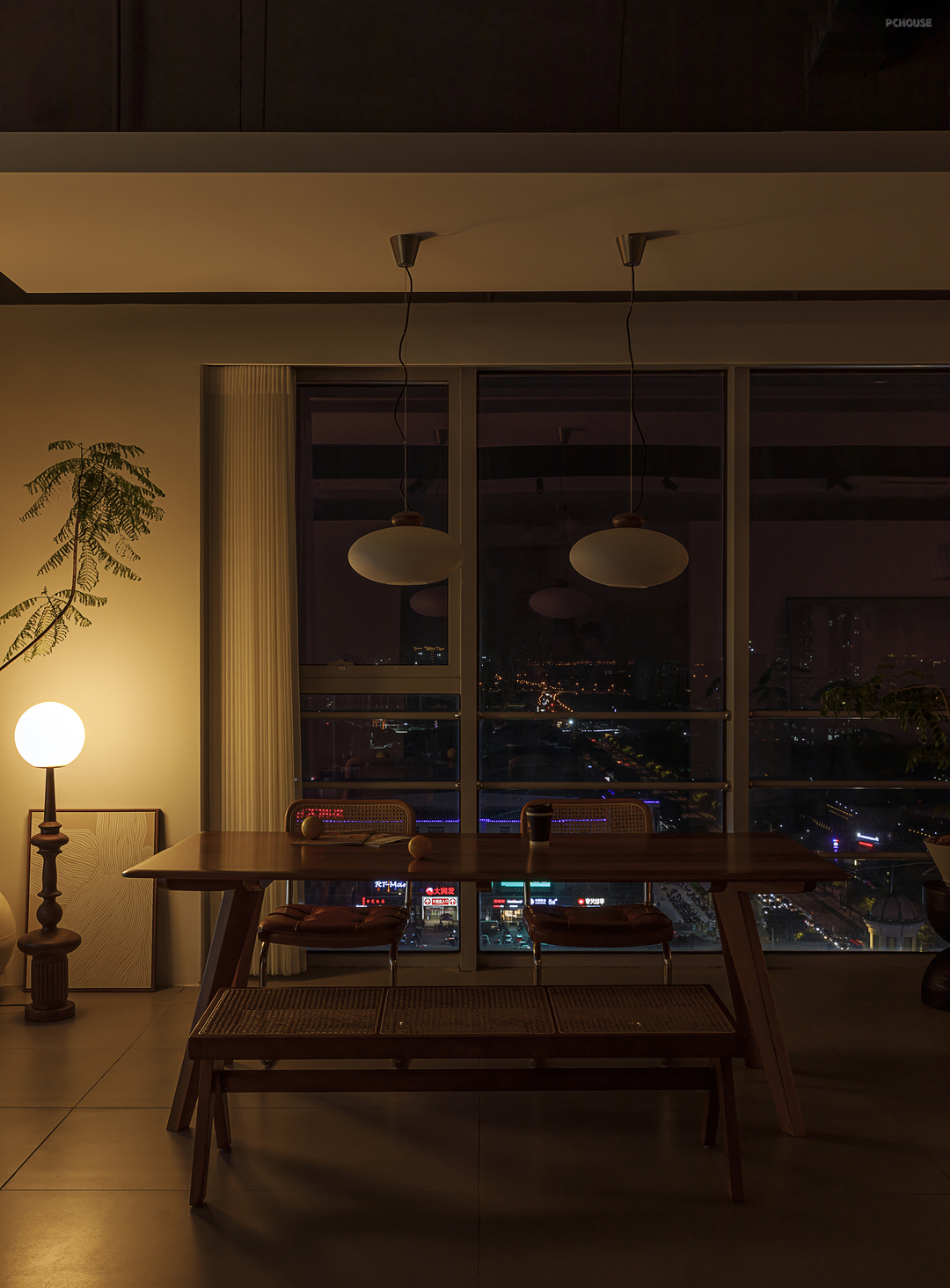 长条木桌,可茶歇、洽谈或小憩。也是用餐区吊灯的场景展示。