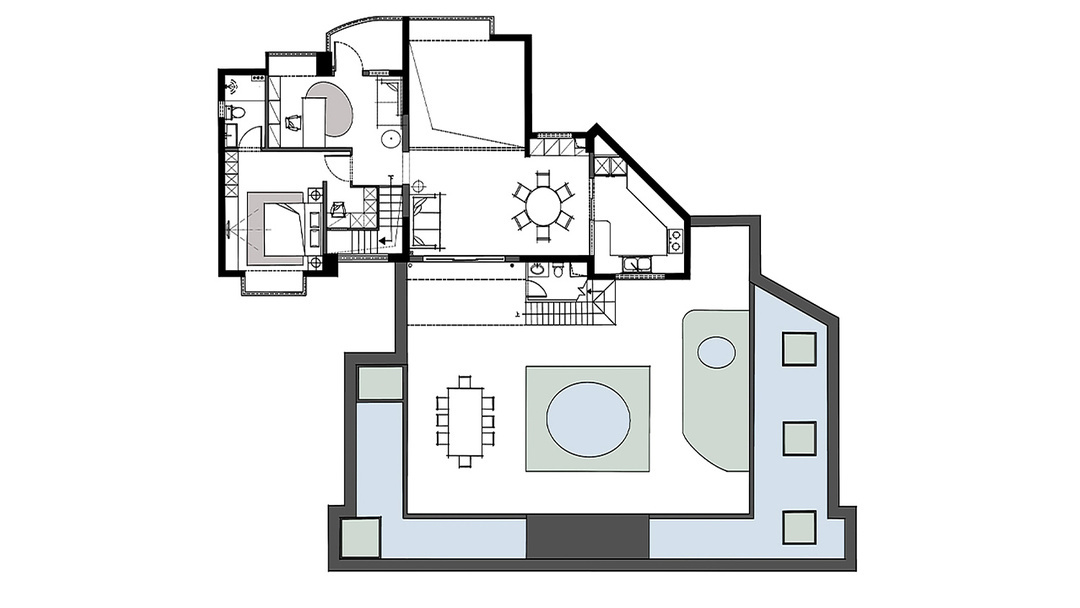 樓梯的作為空間的主軸,運用高級灰大理石材與玻璃擋板,含蓄不失格調,上下聯合,層層疊疊的序列感,衍生空間的趣意。
