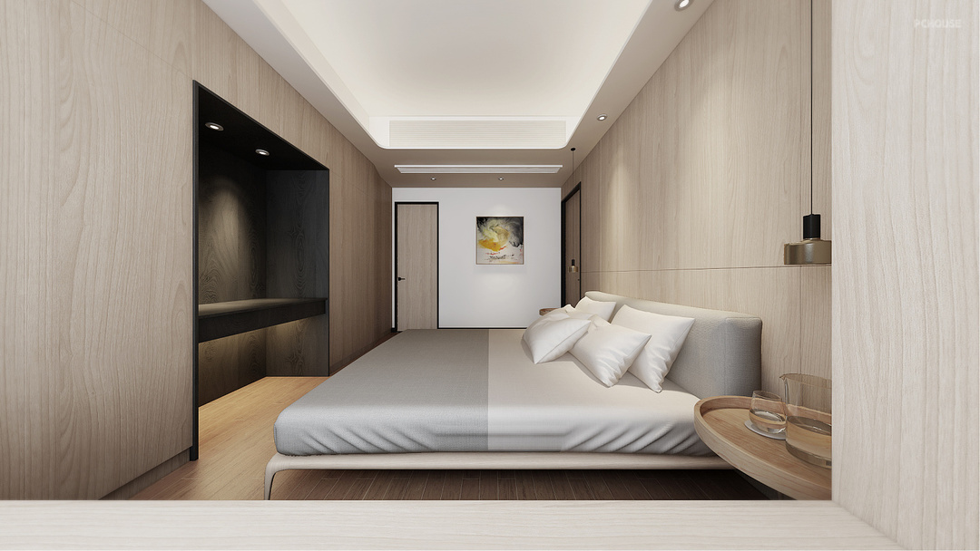 The guest rooms on the first floor have good daylighting and arc shaped balcony design. The vision is particularly open and the quality of life is instantly improved. The intergrated design of embedded bed cabinet is more convenient for the use of multi functional room and increase the turning continuity of moving line.