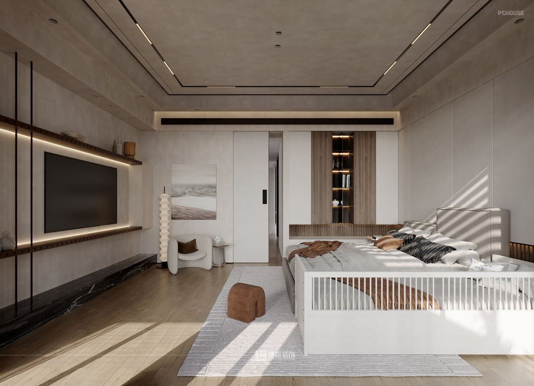 拾级而上到达三楼,主卧的设计运用大体量诧寂风的调性,以其本真之态,泛起淡淡的恬静与时光的温润之美。最大化利用空间,阳台区分小书房及衣帽间区域,使得整体空间更具功能性。