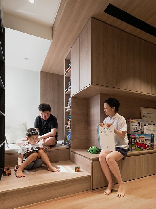 作书房书架做了不规则格子的收纳设计,一些杂乱的小东西都能放在这里;由于工作性质常常需要在家加班,这样的感觉办公会更专注