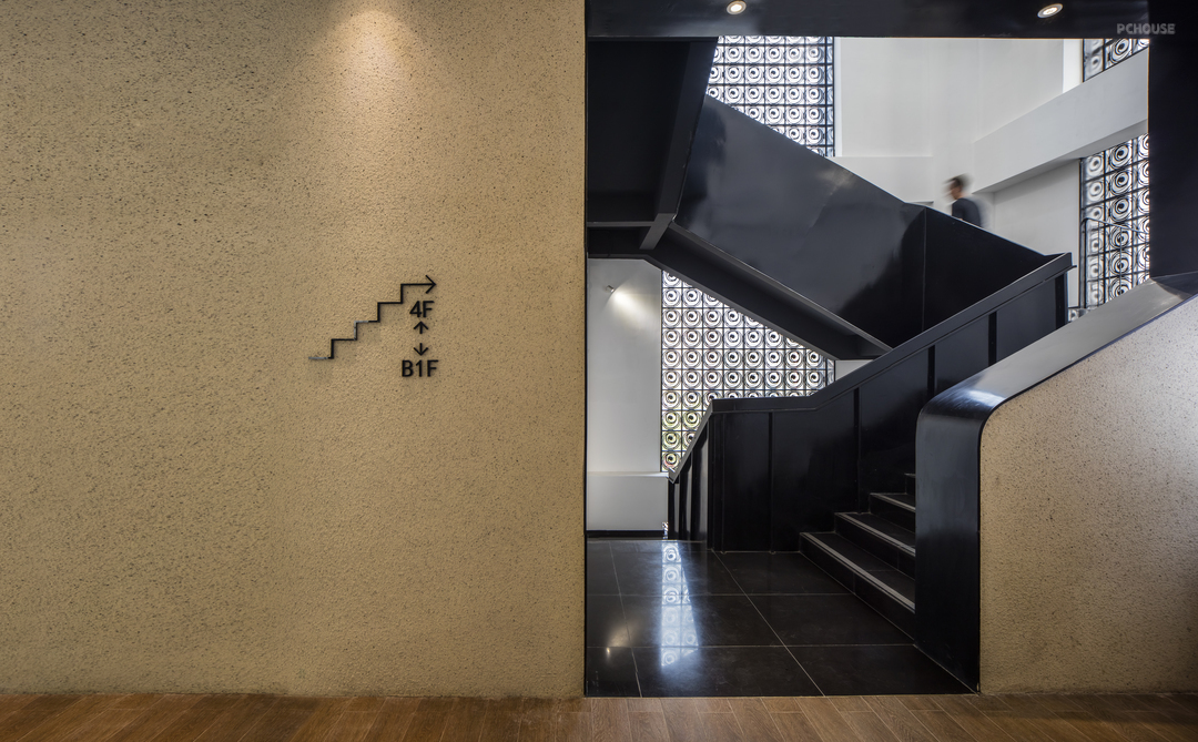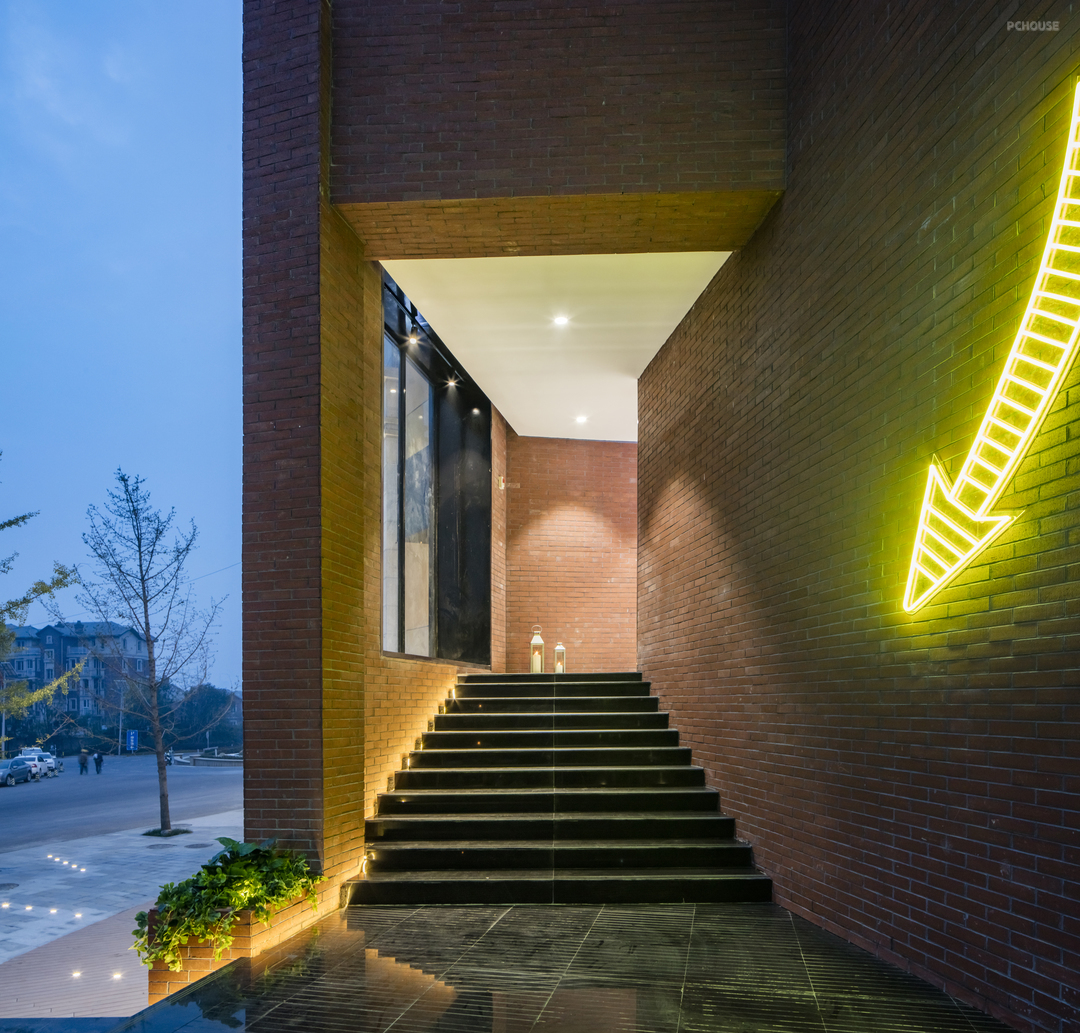 外立面以现代工业风设计为主,布满星光的金属框架表皮下是摩登红砖墙,密犹如都市里隐藏的街市,富于生气而友善。