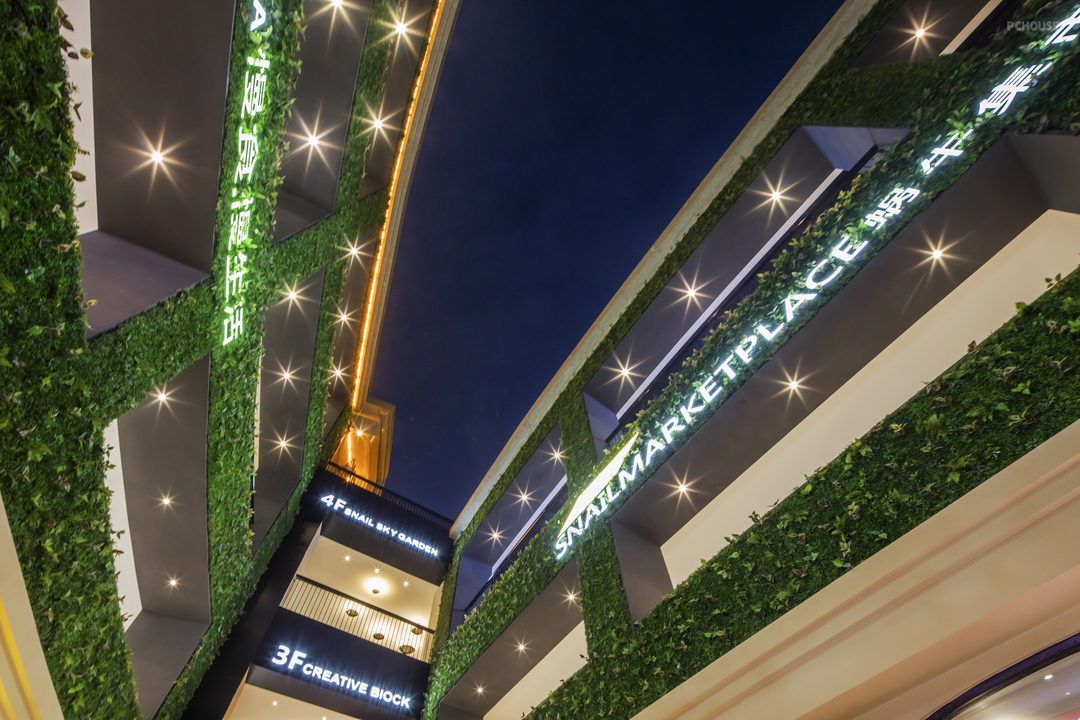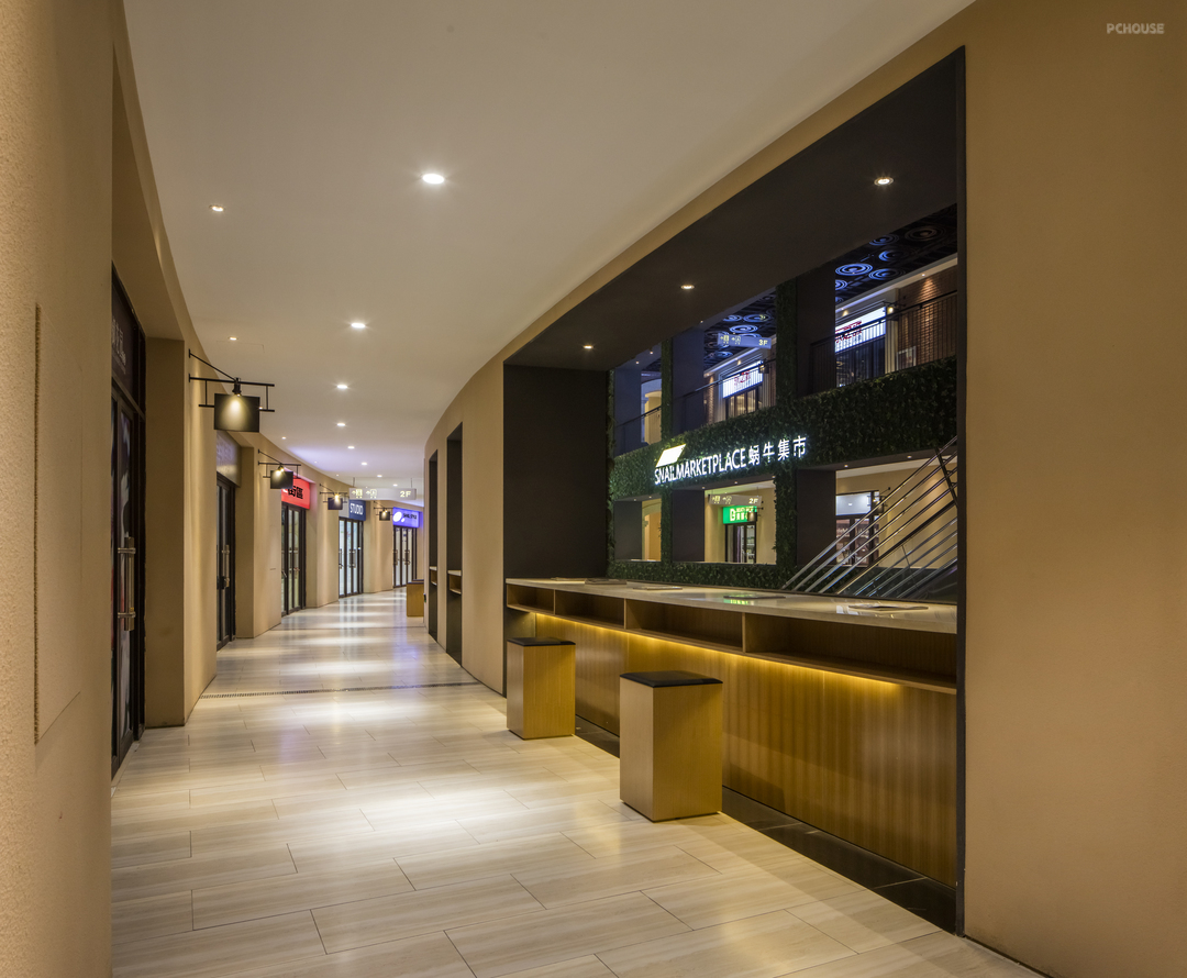 蜗牛是乐观主义者,他带着房子走路;虽然慢但是持之以恒,他相信自己的未来生活都是阳光灿烂,秉承这一理念,设计师申俊伟ELSON以蜗牛形象创造了极具辨识度的图案,作为“VITAGREEN”的空间元素。在设计中反复出现“蜗牛的壳”的抽象螺旋图形,仿佛是随时涌现的灵感和想法,代表着它无穷尽的好奇心和创造力。“蜗牛”出现在商场的各个角落,指引人们前行,同时呼应了“慢生活中心”这一理念。该元素也出现在公共空间的地板、天花、墙身之上,不仅将空间联系在一起,也消除了消费者心理上的隔膜,让他们得以毫无压力的在不同空间中穿行、漫步。