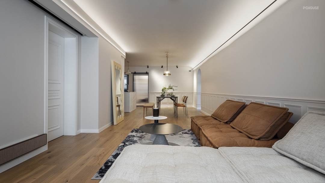 客餐厅以一种完全开敞的结构呈现,让小户型有了豪宅的轩敞感,通铺的地板和上方延伸的线性灯,上下呼应,形成视觉拉伸,公区的统一性进一步凸显。