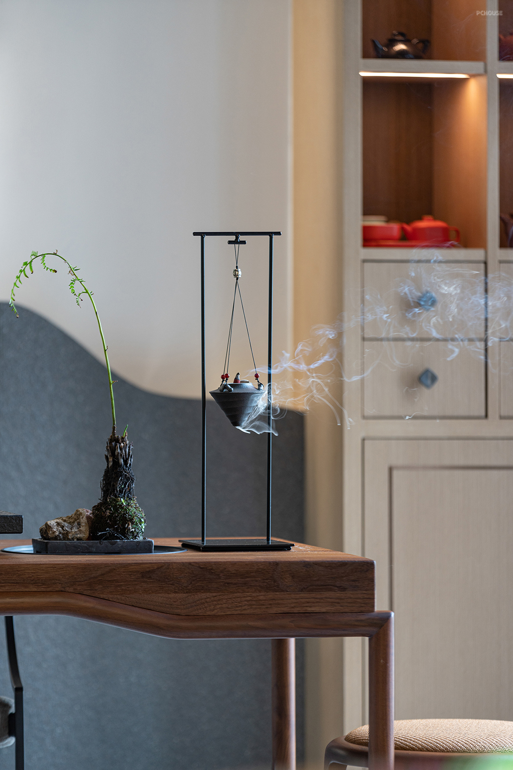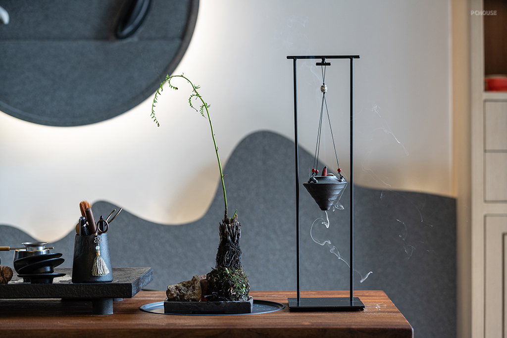 选择了轻盈现代感的家居而非传统中式,让空间看起来更加年轻。休闲沙发是摇摇椅,扶手编制牛皮提升空间精致度。