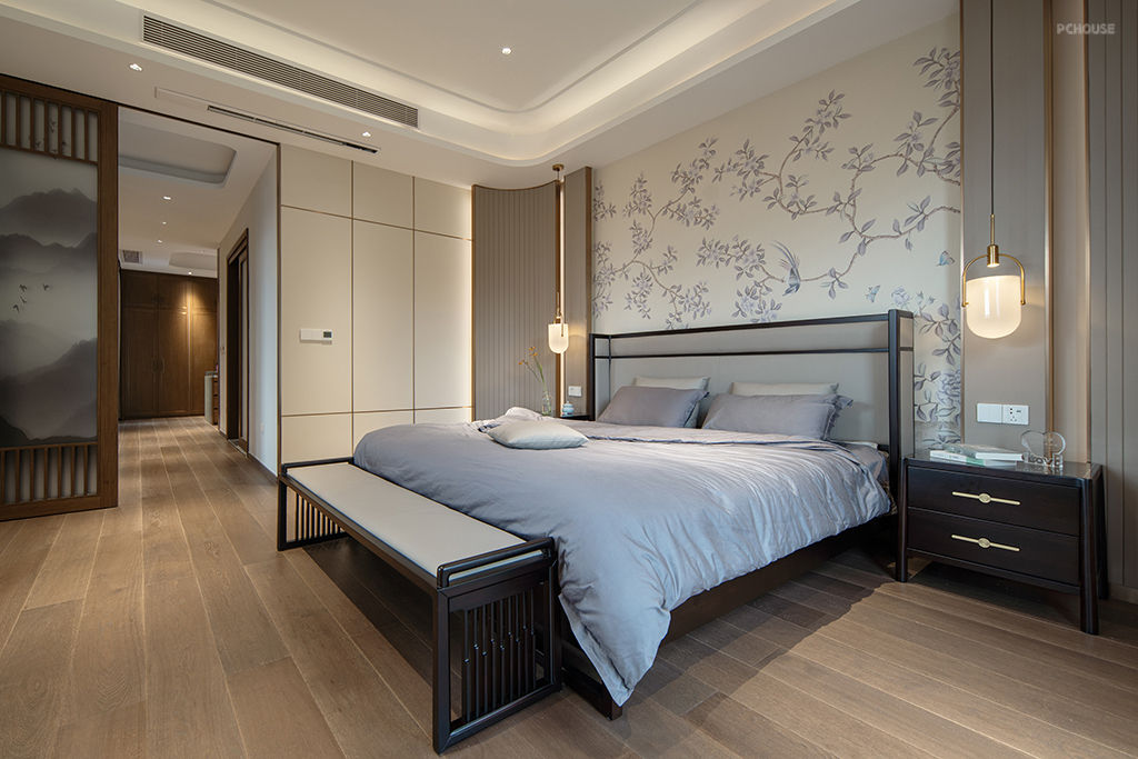 设计了大落地窗的主卧,窗外风景宜人,在休息时也拥有私密感。木质地板增添生活气息,黑色床头柜和碎花背景墙有现代婉约之感。吊灯和软装相得益彰。