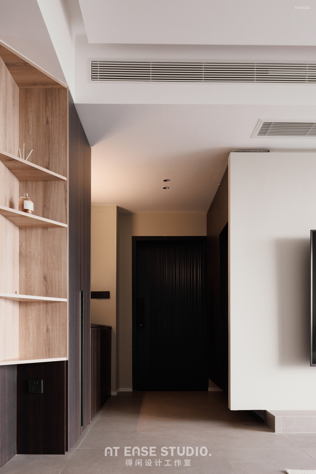 ①进门左侧通顶鞋柜+全身镜组合,右侧为矮柜,增加玄关储物量;