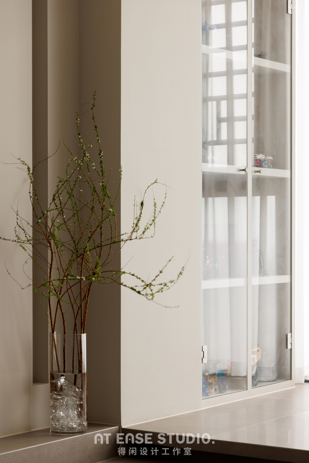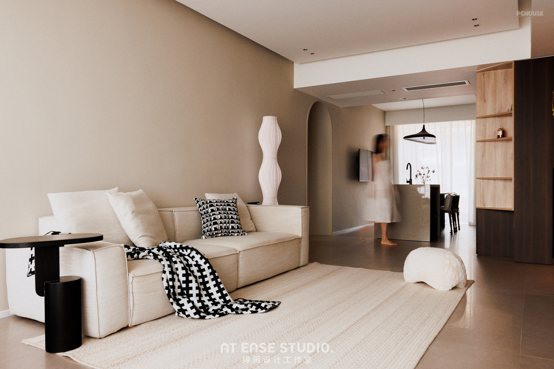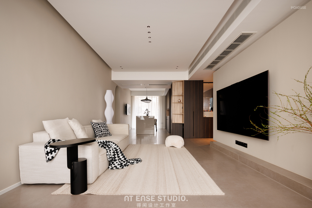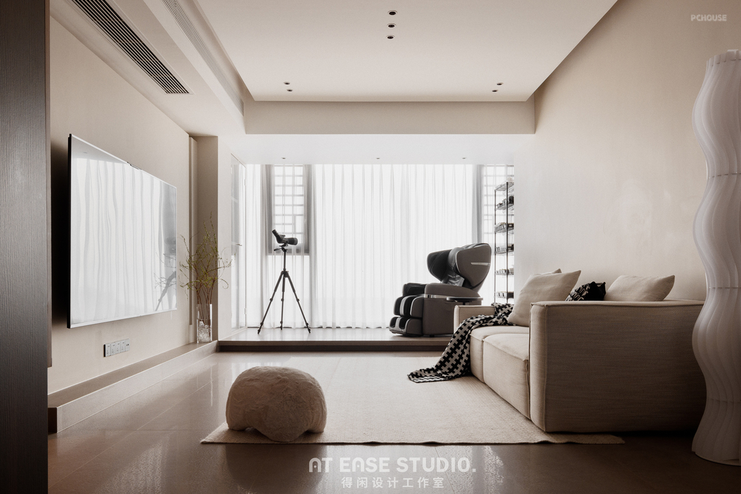 ①电视墙底部砌筑地台与南面阳台的地面抬高连接形成整体,电视墙采用了极简木作造型构造,与地台体块交错营造建筑感氛围;