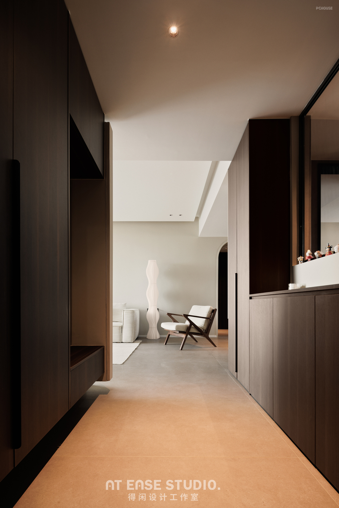 ②右侧鞋柜连接高柜贯穿至餐厅形成餐边柜与厨房进出口;