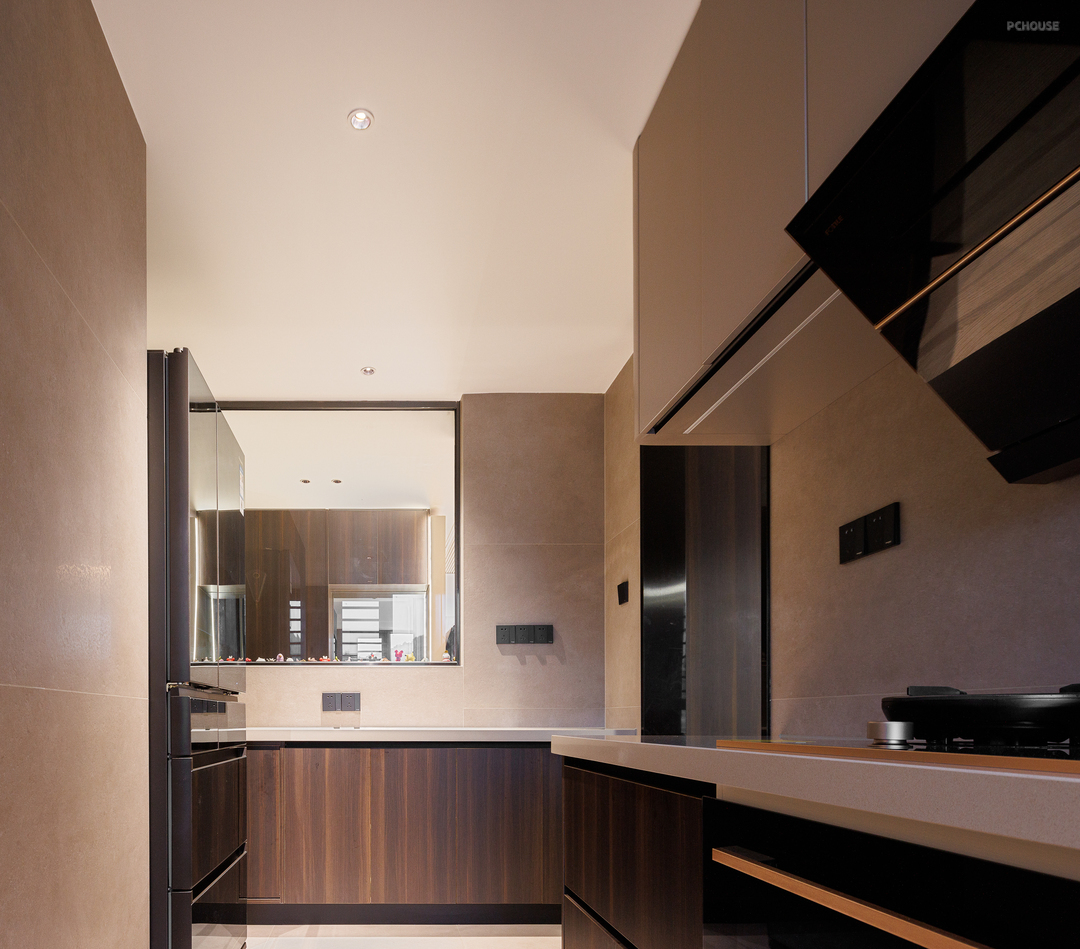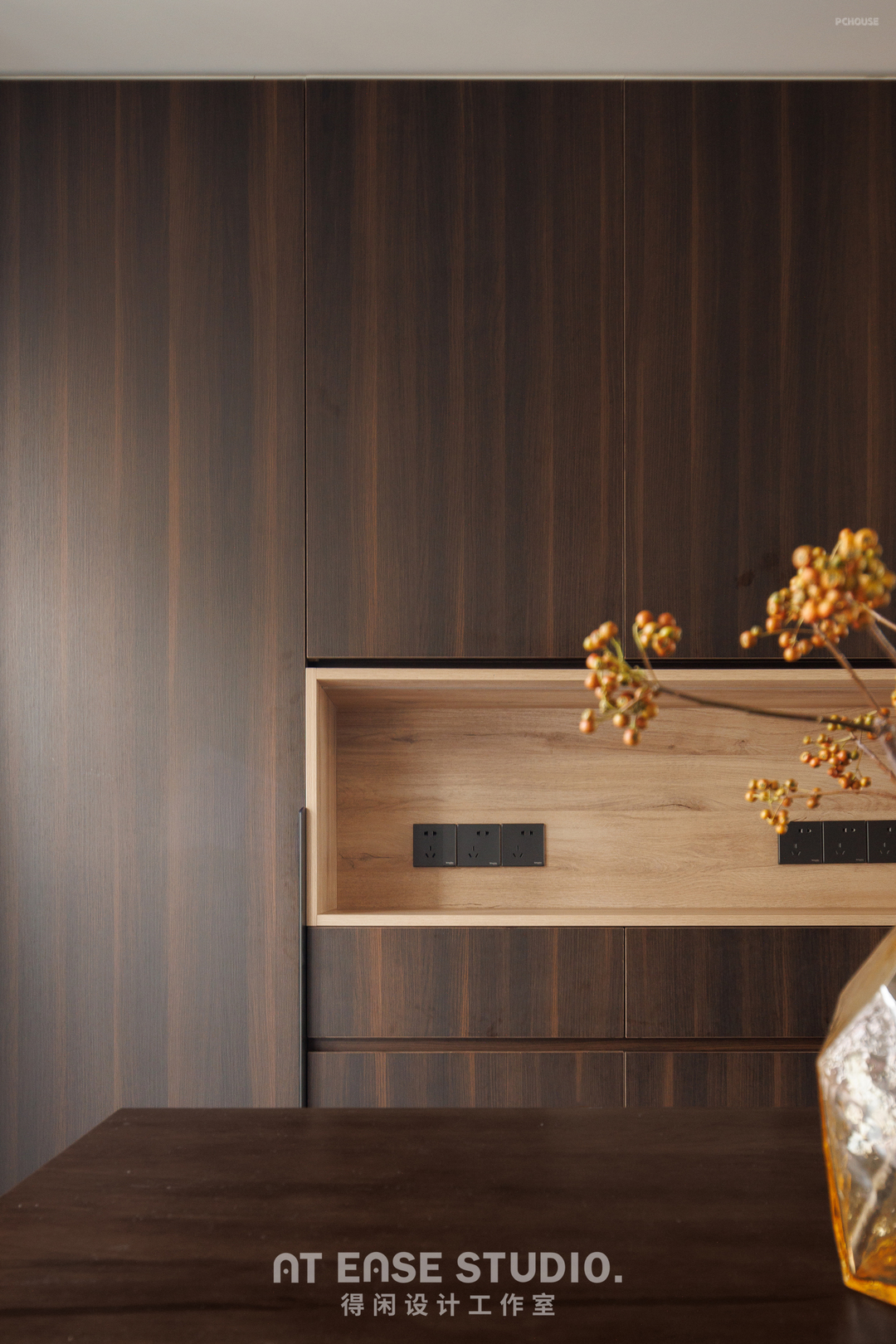 大面积通顶高柜连接而来的路线,开启通往厨房的进出口,将移门藏至高柜背后,充足的餐边柜配备女主心心念念的的岛台