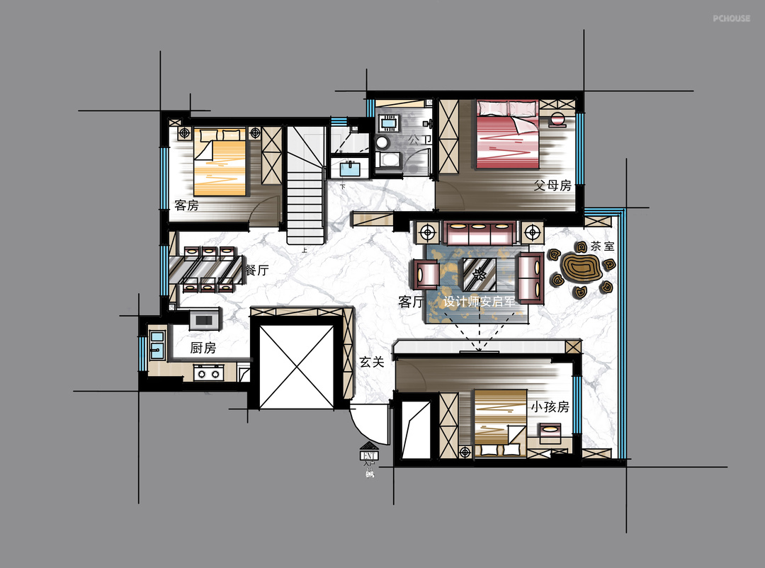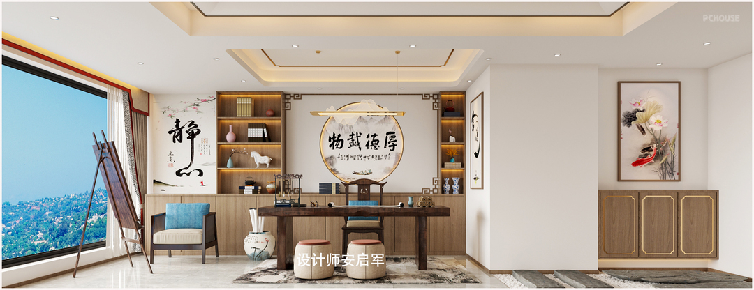 本案业主是一对年轻有为,事业有成的青年小夫妻与父母加上两个小孩的六口幸福之家。业主对当下比较流行的现代风格颇有喜爱,但一家人对艺术和中国传统文化也情有独钟。所以设计师安启军就结合了业主一家平时喜欢书法绘画,品茗,健身,养鱼种花等兴趣爱好及生活习惯定位为禅意新中式风格。
