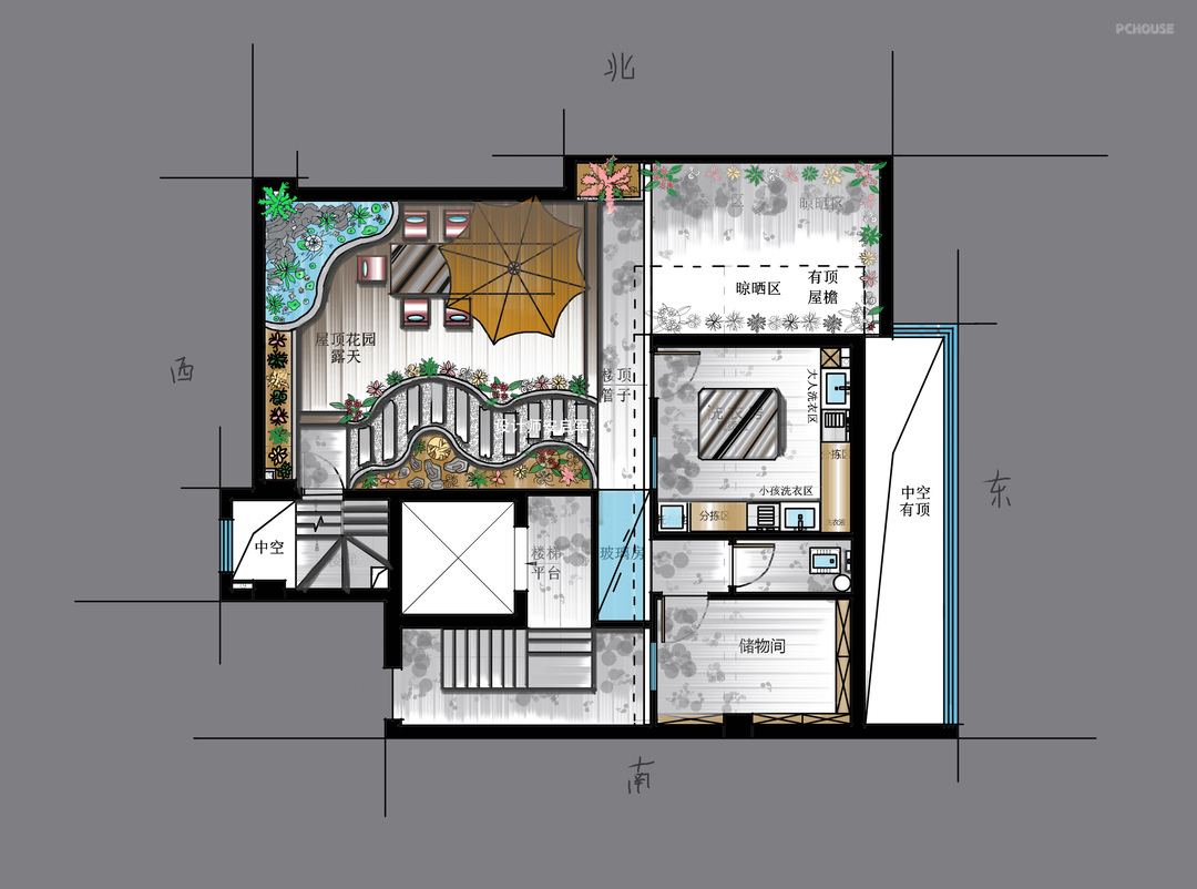 △屋顶花园结合居住者生活习惯和使用功能,回归本真,尽可能的趋向自然或者接近自然,自然而然。