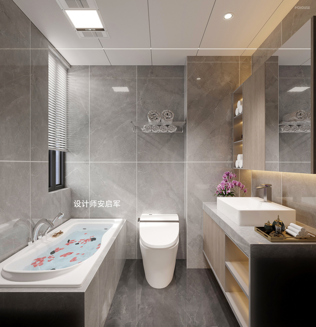 卫生间洁具选用品均是一二线品牌的:TOTO卫浴、汉斯格雅恒温花洒……在以人为本的基础上,倡导一场新的生活设计美学,男女主人下班回来,爱人为其准备了一缸热腾腾的水,洒上几片玫瑰花瓣,浪漫情调油然而生,下班回来泡上一个热水澡,放松一下心情,一天的工作疲惫就会忘之脑后了,所以一个卫生间的空间设计注重干净整洁,搭配设计合理,选用灰色纹理自然300x600的长形墙地砖铺设,便于日后打理,墙地砖以渐变色的形式进行表现,让空间有一种清新自然的视觉效果,搭配长方形洗漱镜框设计,在洗漱盆旁边放上一小盆绿植盆栽,无论是泡澡还是入厕,都会让你感觉到身心舒畅,心情美美哒。