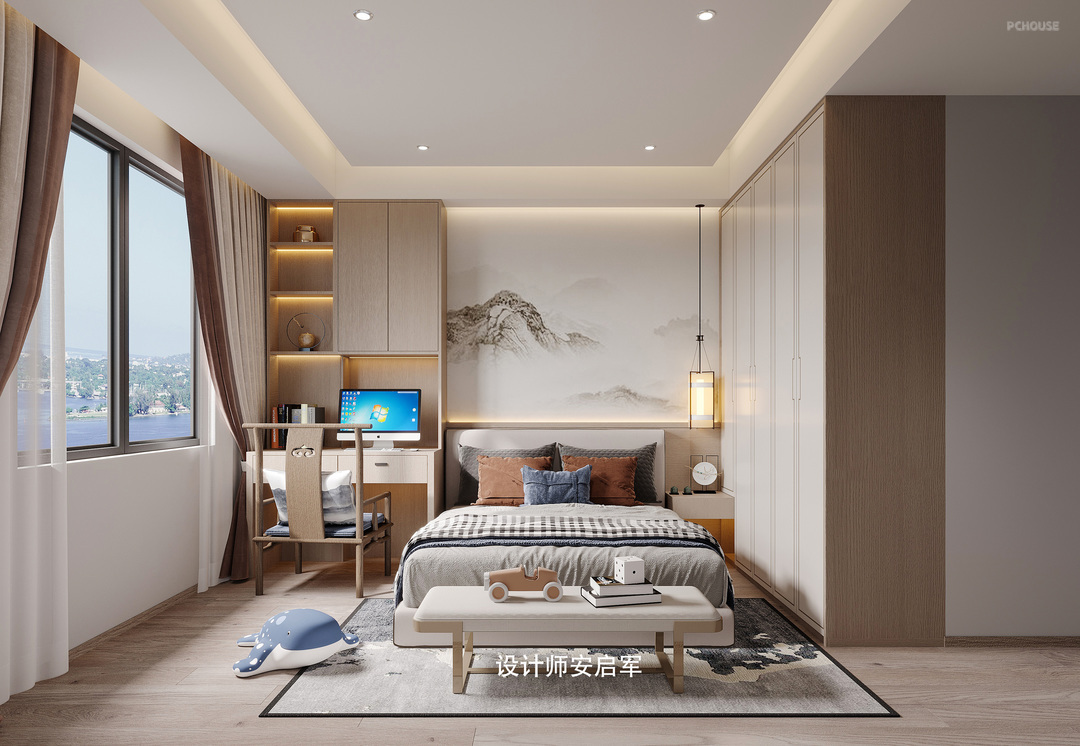 左手边靠窗户设计了一个学习桌,采光通风都非常好,满足了小男孩的学习阅读需求,床头山水装饰壁画,既美化了空间,又与窗外的山水美景遥相呼应,也让空间充满了艺术文化气息,同时还起到鼓励小孩好好学习,天天向上的作用,鼓励他好好学习,在学校学习期间要做品学兼优的班级学科带头人,做班长干部等带领班级同学们一起学习,等大学毕业出来工作了要努力拼搏与创新,争取在工作岗位上做公司的高层管理干部与公司领导者,我们从小就开始培养小男孩的带团队能力与管理能力,引导他爬到山顶的意志和决心,当他努力学习与拼搏创新,达到一个新高度的时候,他会发现,真的是会当凌绝顶,一览众山小啊,所以只有我们充分去发掘居住者其生活需求与自然共存属性之后,美好的生活当自然而然的如约而至了,这就是一种属于空间的本质性力量,像在电影里走出来的人物一样,从小就有着对梦想的执着与美好生活的向往,加之设计师安启军有着对文学、自然科学、艺术、建筑、景观、哲学等各领域长时间的专业研习经历,以及6年多对高端客户群体生活的设计服务经验,通过空间布局搭配设计的手法,去影响和激励他变优秀,一个小小的家居空间,往往有着深厚的文化背景,承载着厚重的文化使命,也不同程度地影响着居住者的人生命运。空间的塑造决定人的行为习惯,行为习惯决定人的性格,性格决定人的命运。优秀的设计应该尊重民族