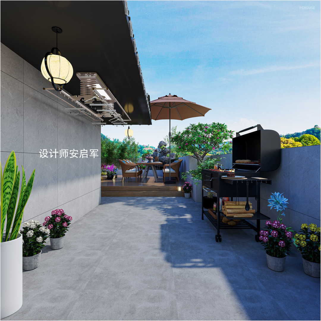 屋顶洗衣服空间设计,设计师安启军根据业主一家三世同堂,常驻人口比较多的生活需求,精心为业主私人定制设计了这个洗衣房,既满足居住者一家的日常洗衣区功能化、高效化和组织化的生活需求,一个设计精良、设备齐全的洗衣房可以让你的生活变得更简单便捷,尤其是当你需要经常洗衣服的时候。在进入洗衣房空间里,往前走去开放格是洗衣液等洗涤用品的收纳区,吊柜是换季棉被和厚衣服的储存区;台面是大人衣裤分类区、大人洗衣区,左边是小孩衣裤分类区、小孩洗衣区,吊柜是换季棉被和厚衣服的储存区,地柜内置的洗衣机和烘干机和一些储物收纳柜,中间导台是翟邹衣物熨烫区,靠窗边是托帕清洗放置区,室内窗户顶上装晾衣架做室内晾晒区和花园屋檐下面作为室外晾晒区。可根据天气变化来选择晾晒区域,无论你是有一个大的房间作为洗衣房或是只有一个壁橱空间,我都希望你好好的布置规划设计一下你的洗衣房,可以让您洗衣更容易、更有条理。因为他将有助于洗去你生活中的烦恼,让你在以后的洗衣过程中更加的轻松便捷,心情愉悦。