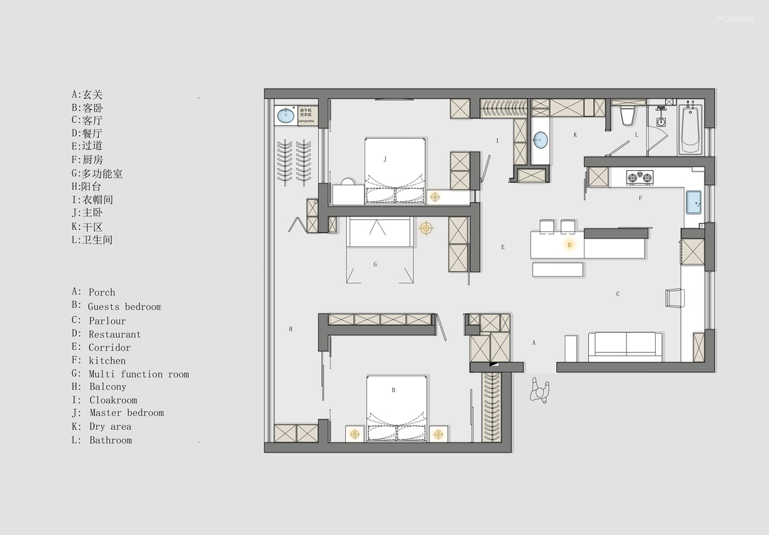 1:改变东南卧的开门朝向,利用原有的门洞的位置深度将鞋帽柜与衣柜置入其中。靠近沙发的位置放置了一组多功能储物柜,平时可以充当换鞋凳使用。