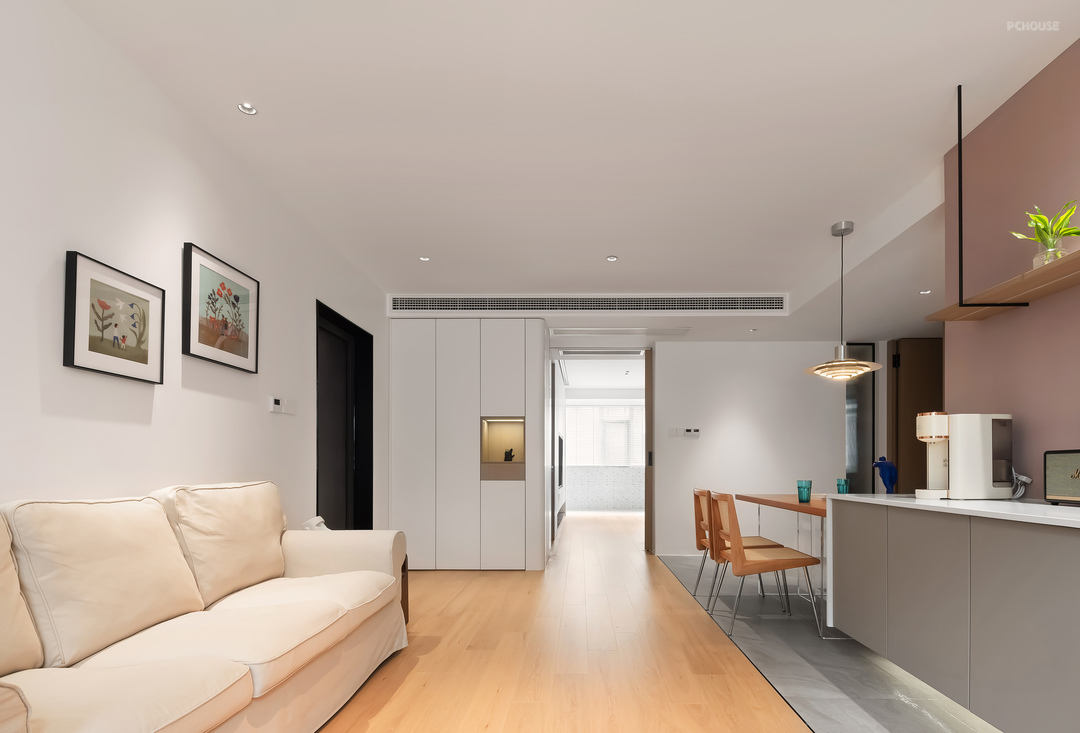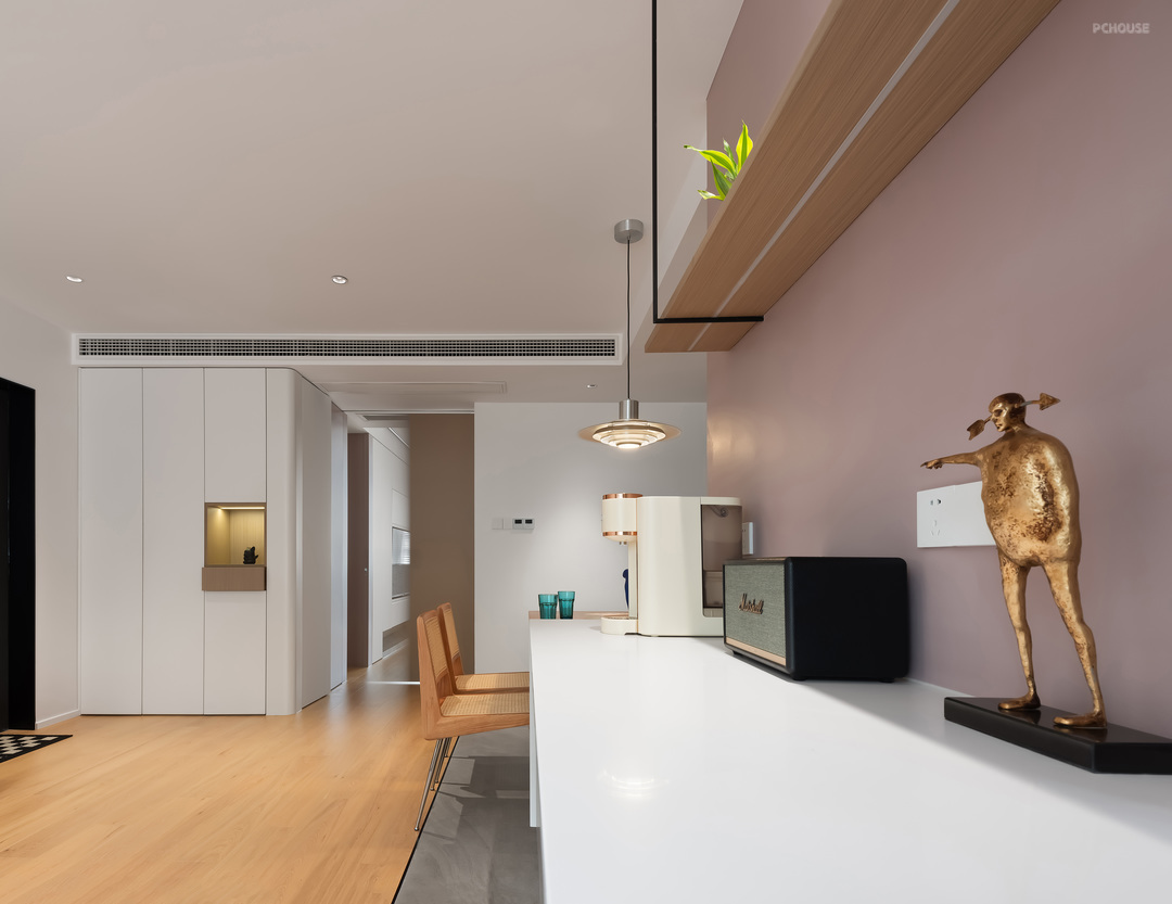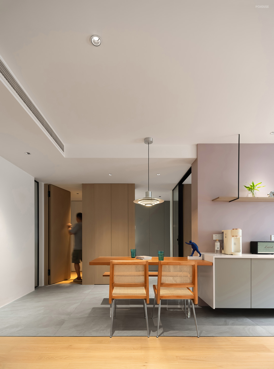 男屋主是健身教练,是个深度游戏爱好者,女屋主是护士,爱好烹饪,对于空间,他们希望家里尽量开放,不要过于孤立,他们希望增加家里的互动空间,对于收纳,他们希望家里的柜子不要刻意出现,而是和空间相融,对于材质和色彩,他们偏爱暖色系的木质基调和饱和度低的暗粉色。