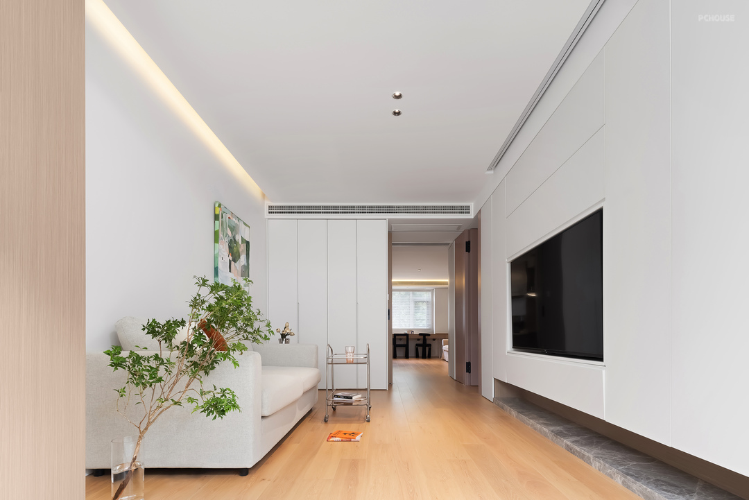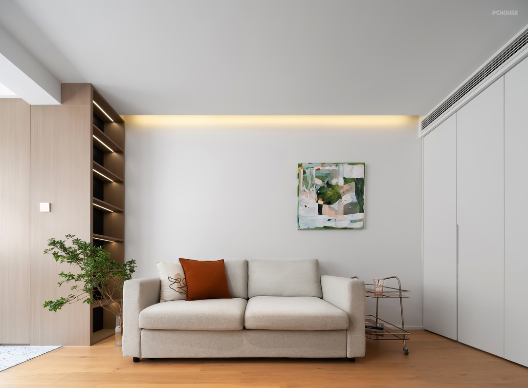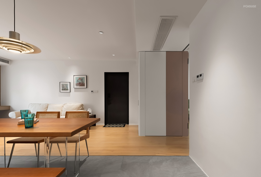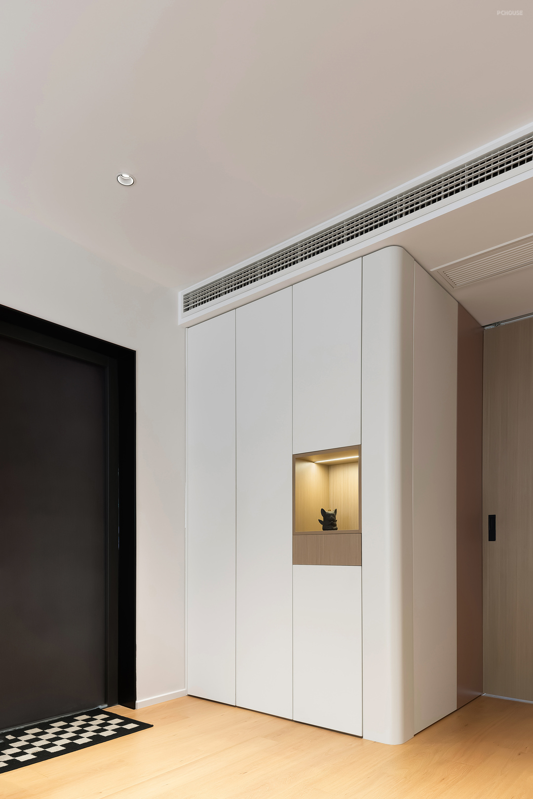 为了让卧室的门在空间中不凸显出来,我们将卧室门隐藏在整个储物柜中。