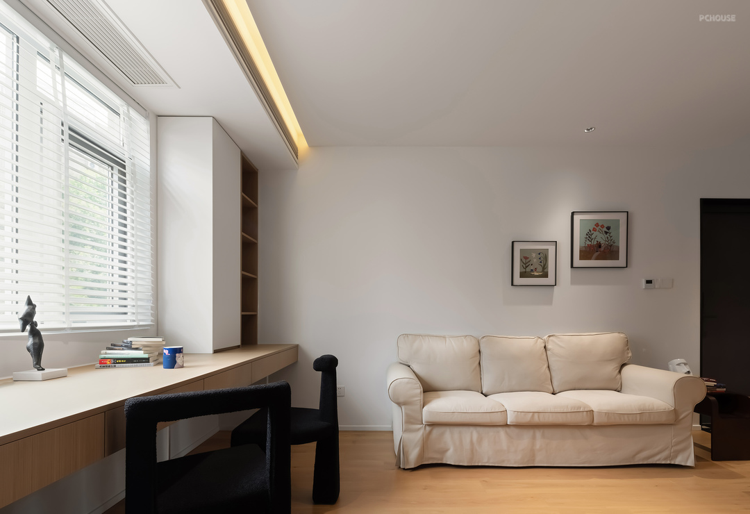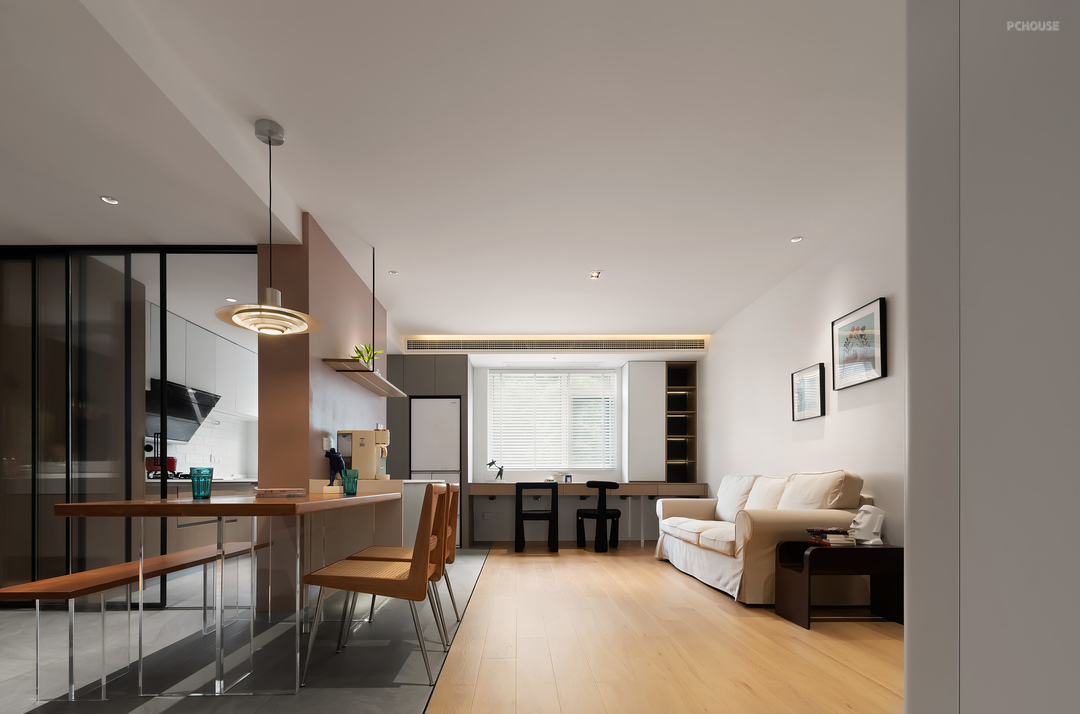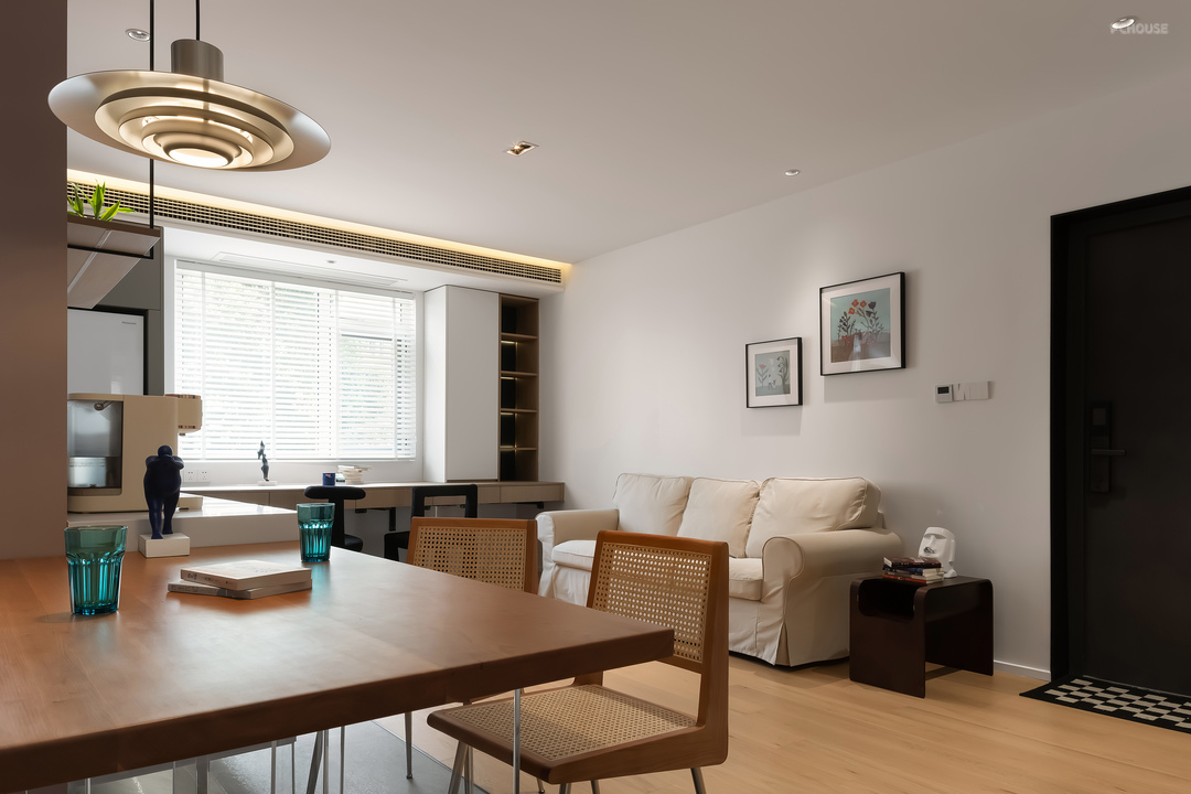 改造后的客厅整体空间更具包容感,沙发、书桌和餐桌相互关联且又独立存在,在这个空间中,屋主和家人可以增加互动,增近彼此的感情。